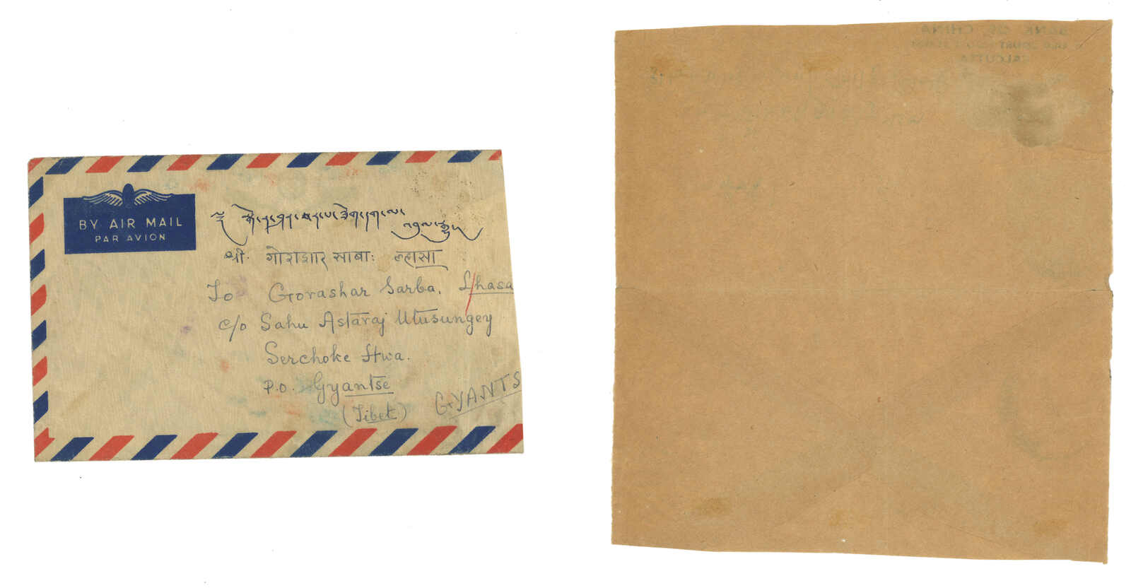 1949 and 1955 a pair of incoming covers to Lhasa and Gyantse, both with combination franking of Indian and TIbet local post issues. As Indian post in Tibe was handed over to the PRC in 1955, the 1955 cover was especially