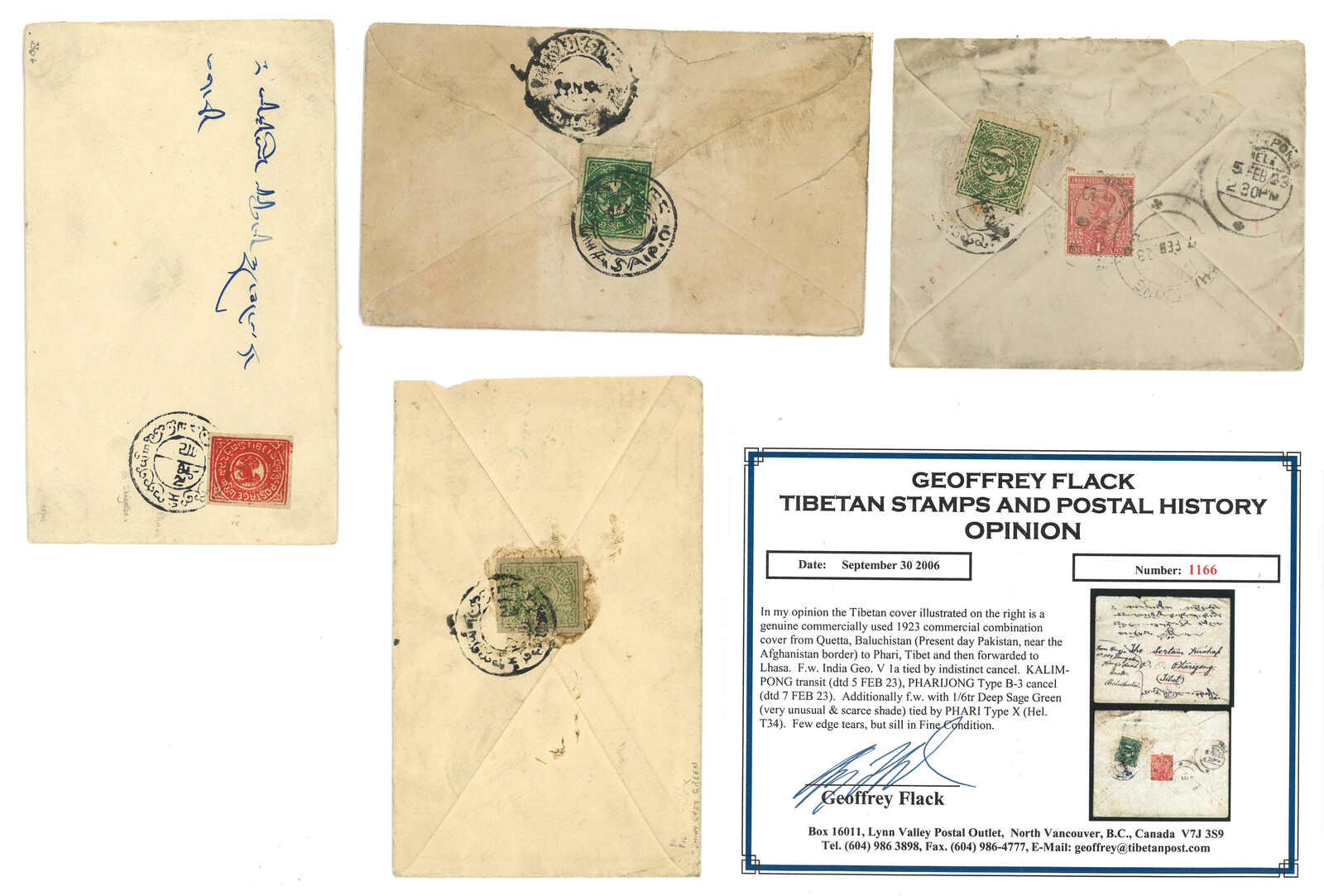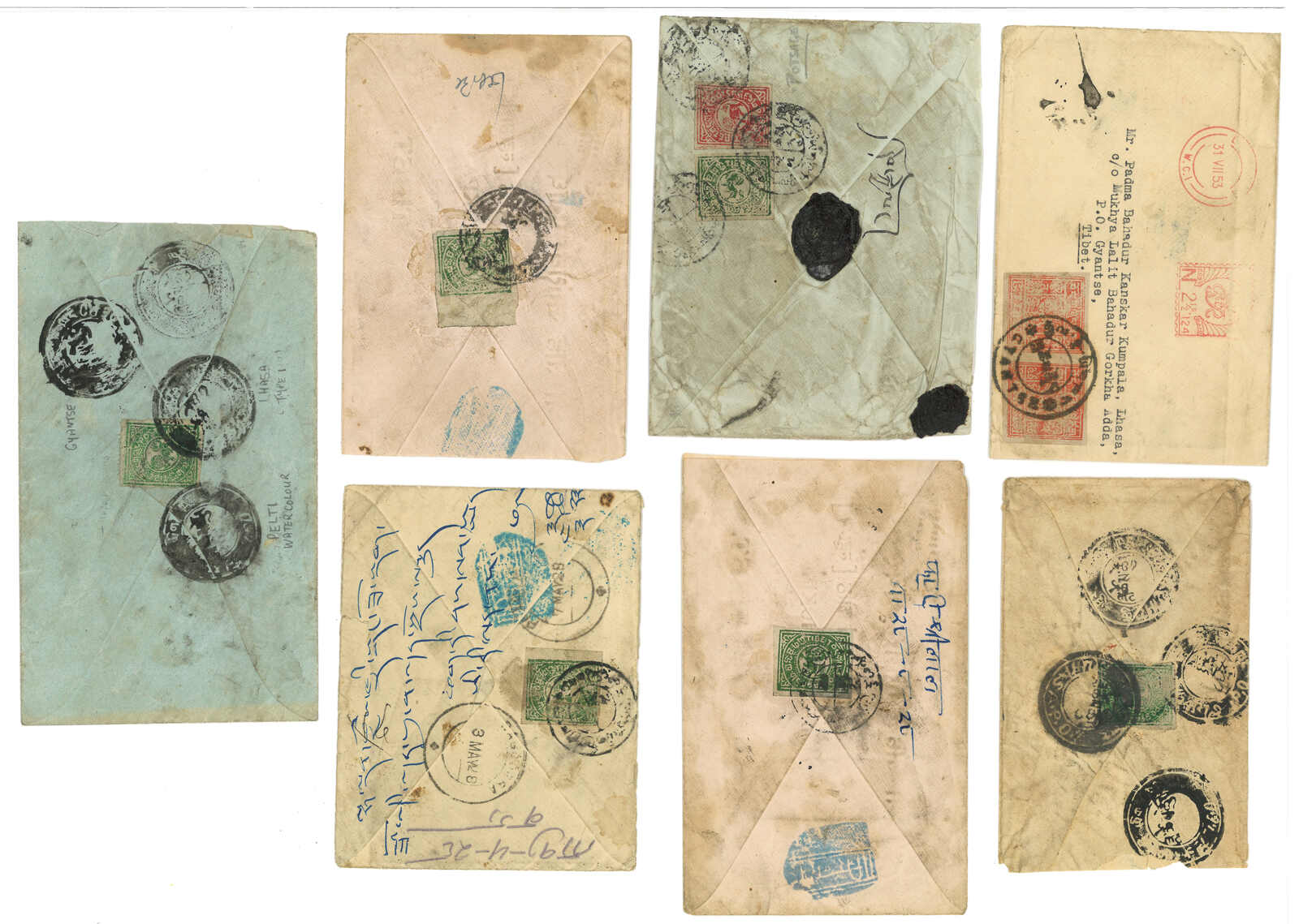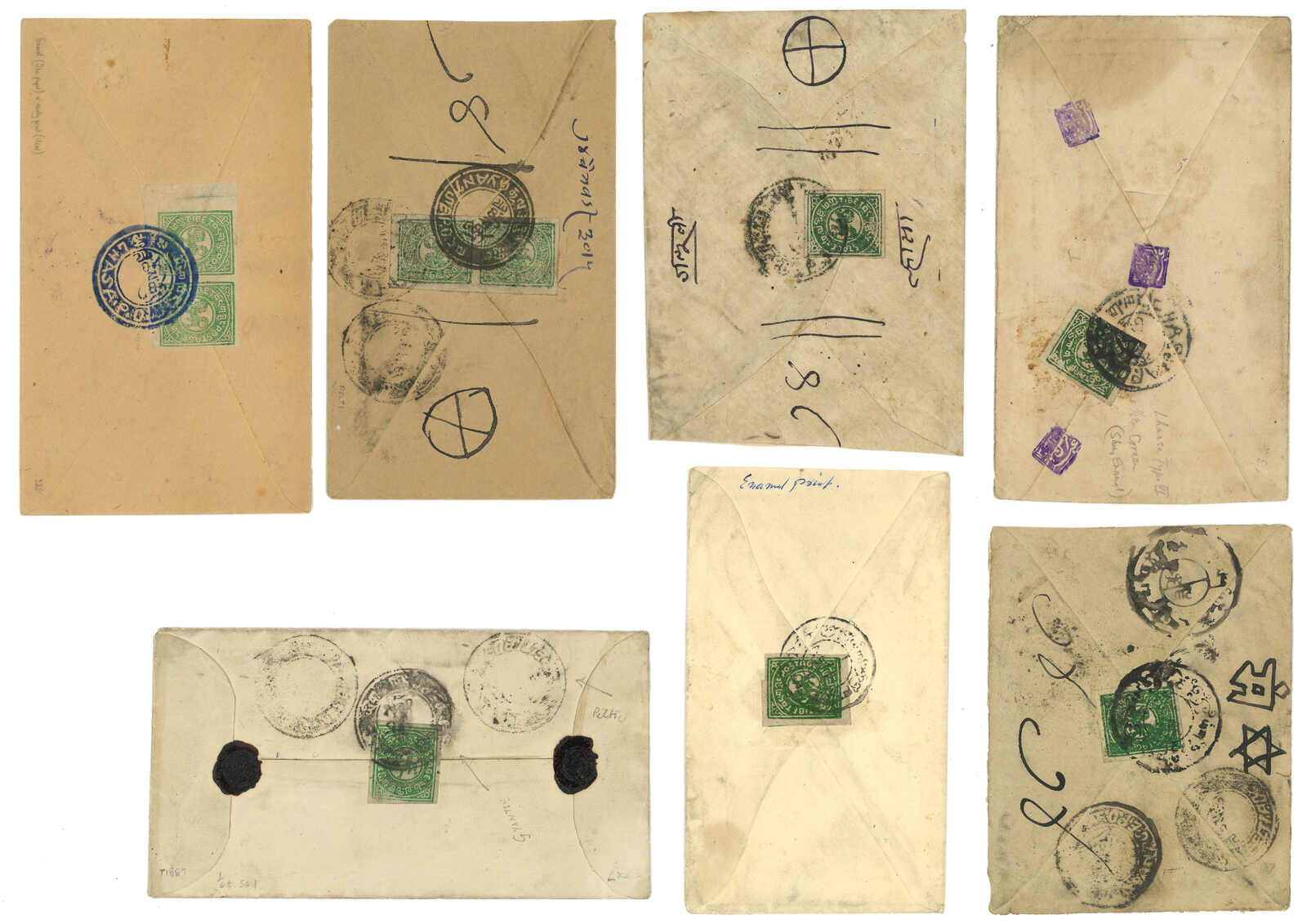 一組六件貼有西藏獅圖第一版票之實寄封,展示了不同郵資。當中一件蓋有稀罕之西格孜1型藍綠色戳記。(Image 1)