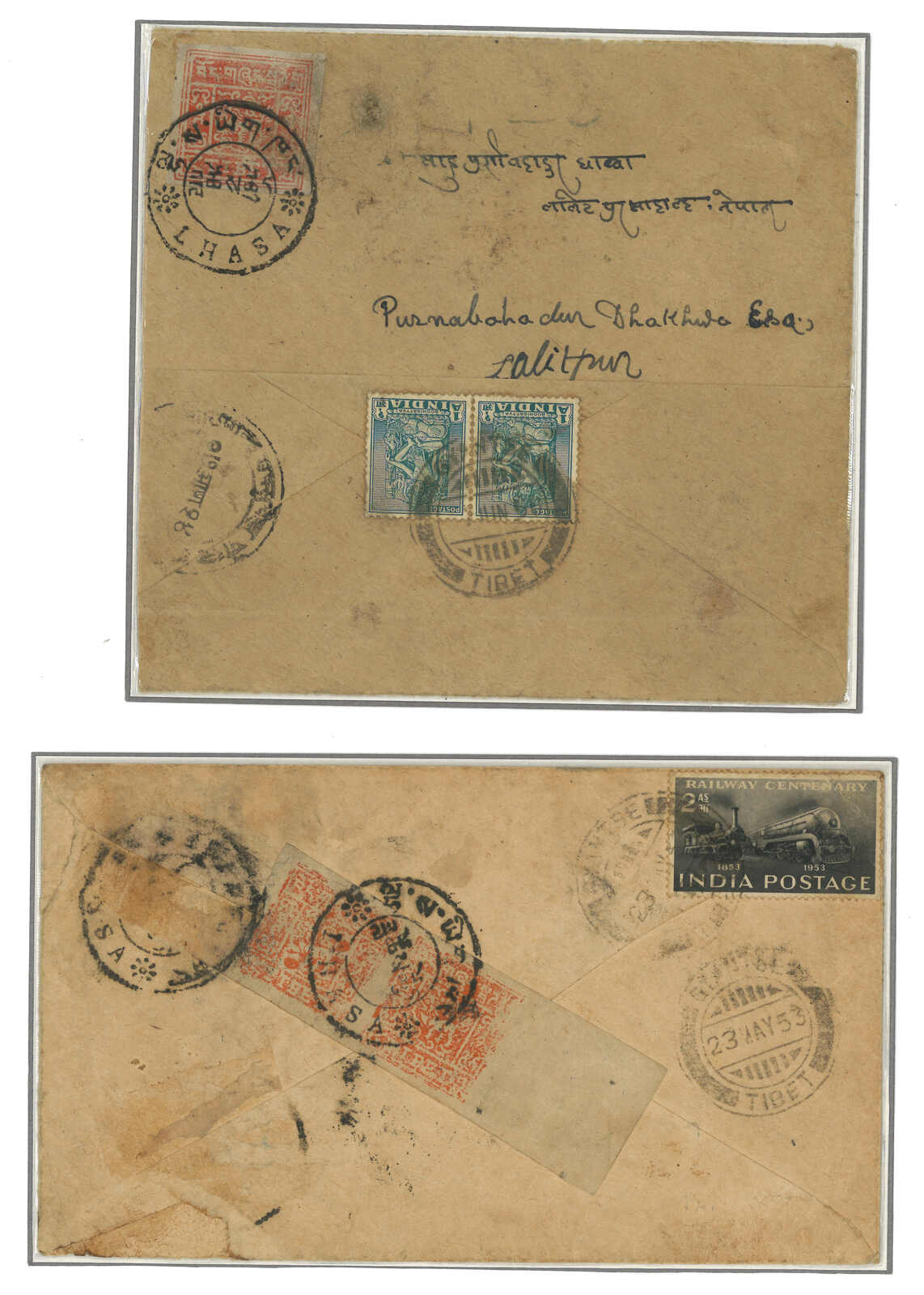 1950 and 1953 a pair of covers from Lhasa to Nepal, f.w. Tibet 3rd issues, tied by Lhasa h.s. In combination with Indian issues, tied by Gyantse Indian Post cds. Showcaing the raise of postage.