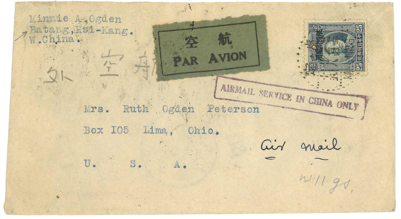 1936.3.28 康定寄美國。航空封,貼孫像加蓋限四川貼用5分直五連 + 2角5分,合5角國際信函 + 國內航空郵資,銷 康定三格點線日戳。4.4經成都,4.6經上海。正鈐“AIRMAIL SERVICE IN CHINA ONLY”橫戳。出自巴塘之稀罕郵例, 日期更與長征期間國共追逐對峙時十分接近。另外亦是使用“康定”而非“打箭鑪”郵戳之甚早例子。(Image 1)