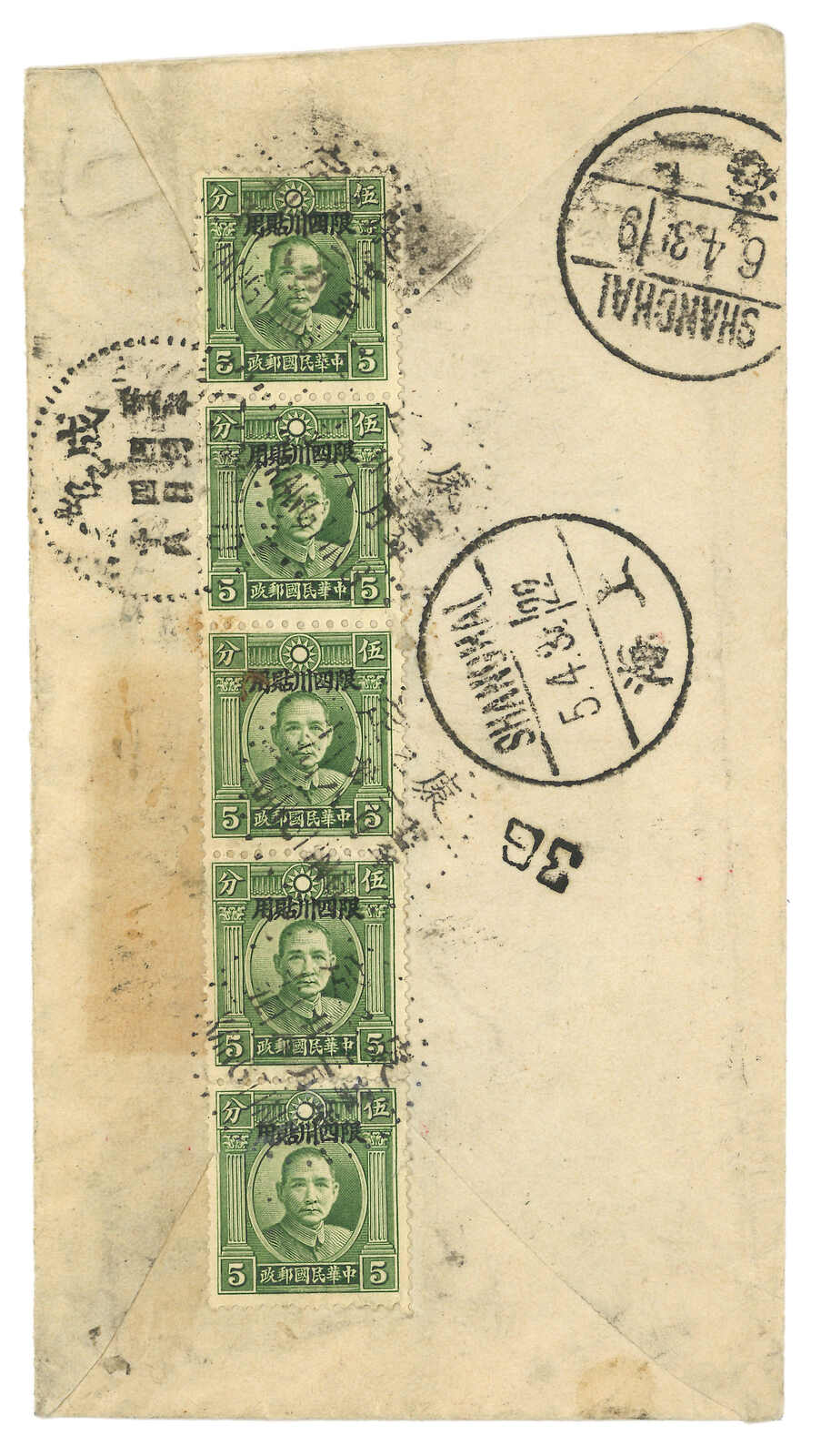 Apr), Shanghai (6 Apr). On front with “AIRMAIL SERVICE IN CHINA ONLY” cachet. Scarce example of Batang, dated just after the confrontation between KMT and CPC during Long March. The usage of Kangting instead of Tatsienlu cds is also rather early.