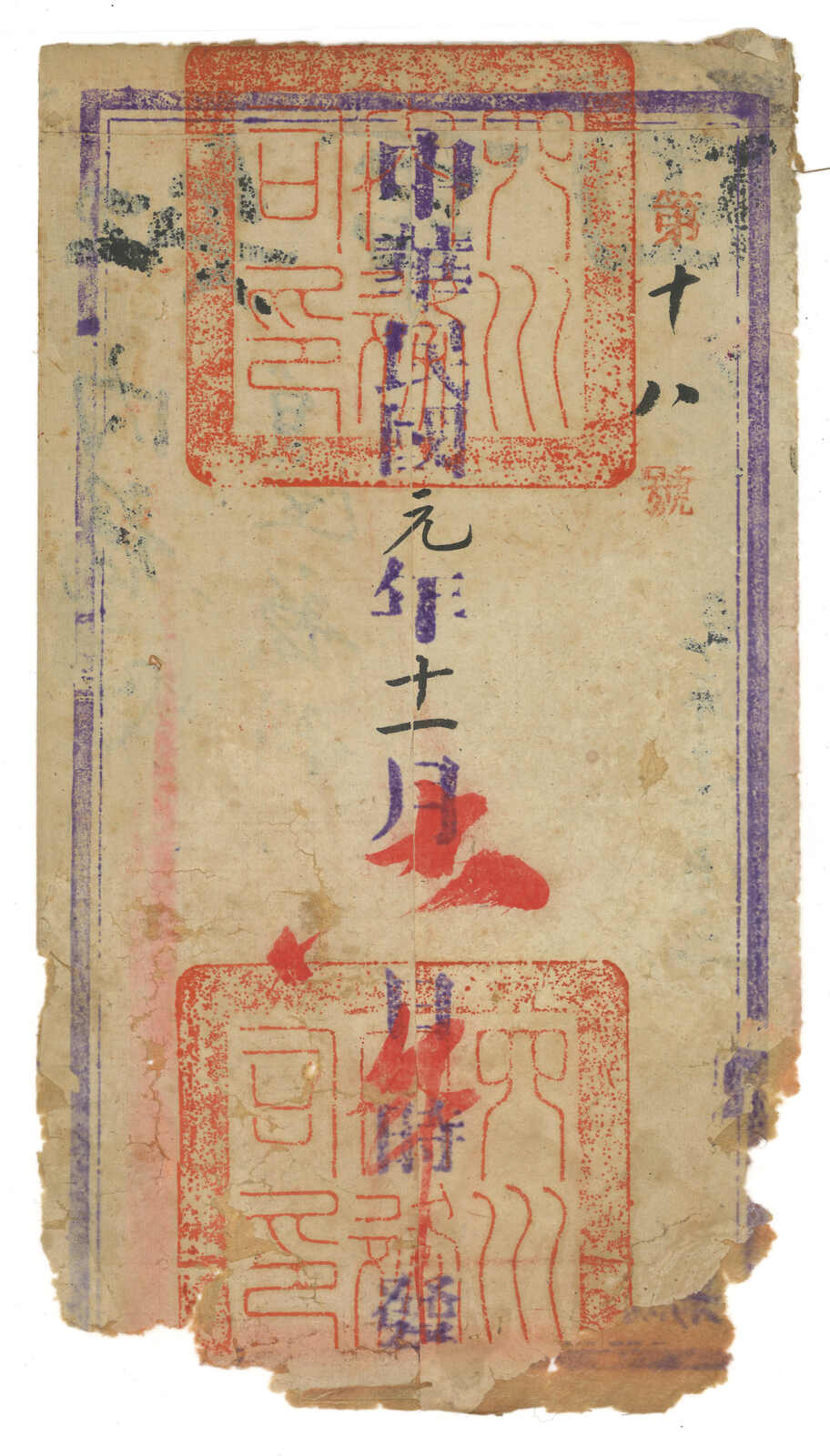 1912.11 征藏軍事封寄松潘廳知事,鈐“成都公文郵便”4型橢圓形戳記。封底兩角有損但不影響郵戳。 1912年,民國派軍阻止西藏獨立。征藏軍以驛遞方式傳遞軍政公文,王劍智及蔡盛著《青康藏郵驛史》 記錄存世信封有九件,在多年拍賣場上另見一兩例但仍稀罕萬分。可謂中國軍郵之鼻祖。(Image 1)