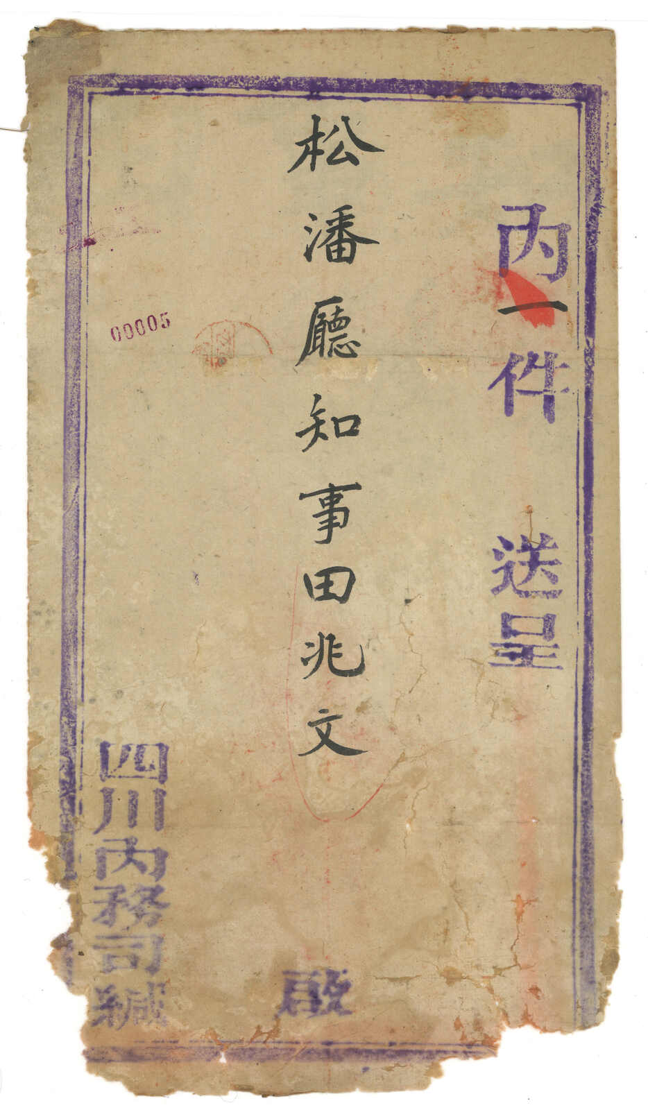 1912 (Nov) Official cover from the Tibet Expeditionary Force to Songpan, applied with “Chengt Official Mail” type 4 cachet in red. Cover damaged at bottom corner but not affect the main body. In 1912, ROC sent troops to stop