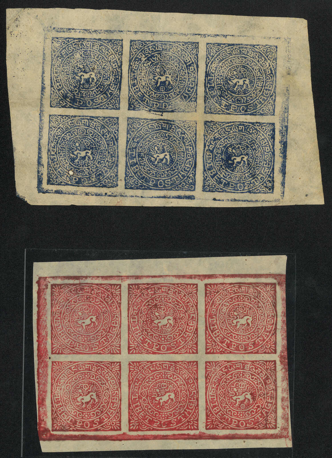 1933年西藏獅圖第三版2章噶樣票2枚,及兩枚蓋銷剪片,均出自9號及8號子模可作對比。 稀罕難得。其中一張為新票全章,另一張為舊票重組,新舊各一十二方連全張。(Image 1)