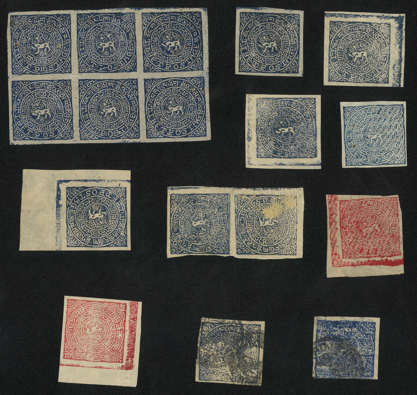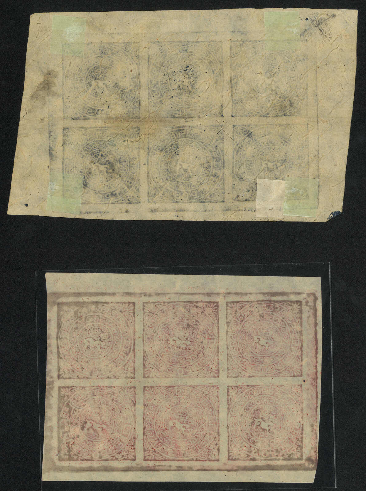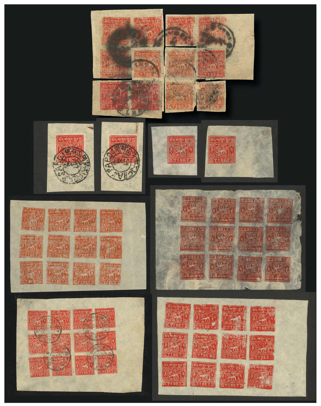 1933 Tibet 3rd issue 2tr proofs, from cliche 9 and 8 (with CTO stamps from same cliche for comparation). Plus 4x complete sheet of 12 and reconstructed sheet from used stamps. Scarce.