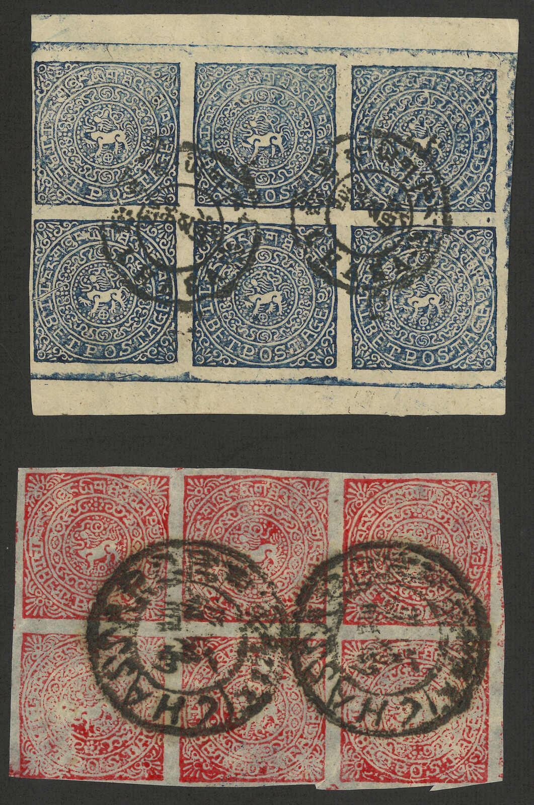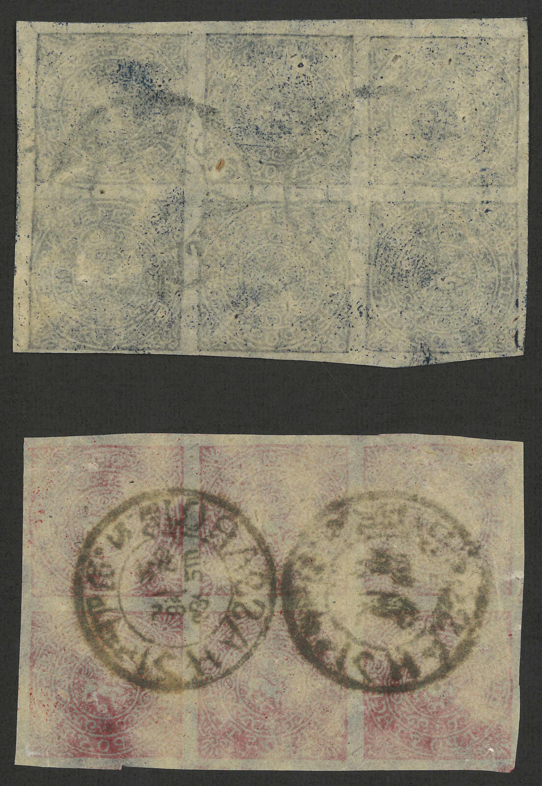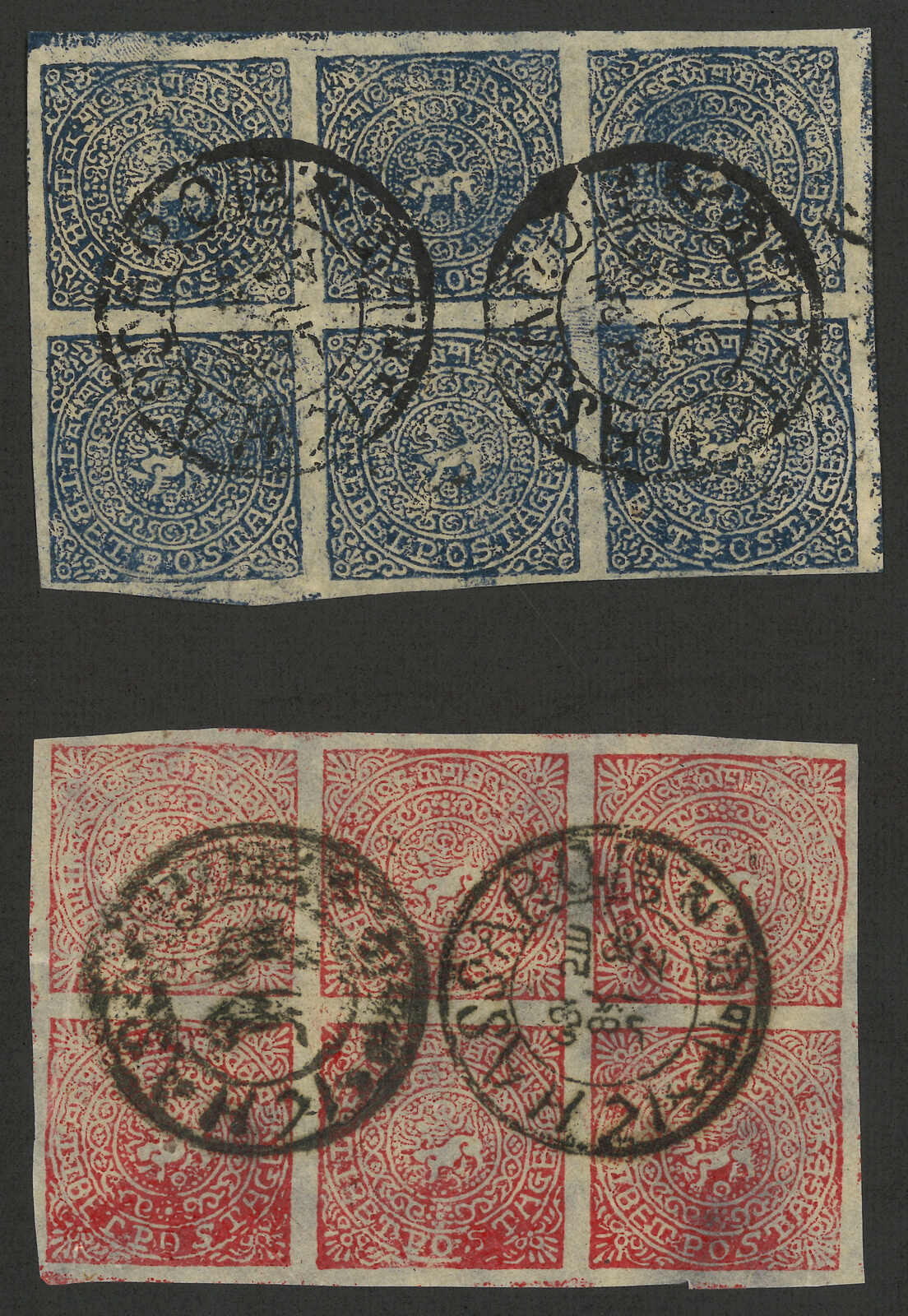 1933 Tibet 3rd issue 2tr proofs, from cliche 9 and 8 (with CTO stamps from same cliche for comparation). Plus 4x complete sheet of 12 and reconstructed sheet from used stamps. Scarce.