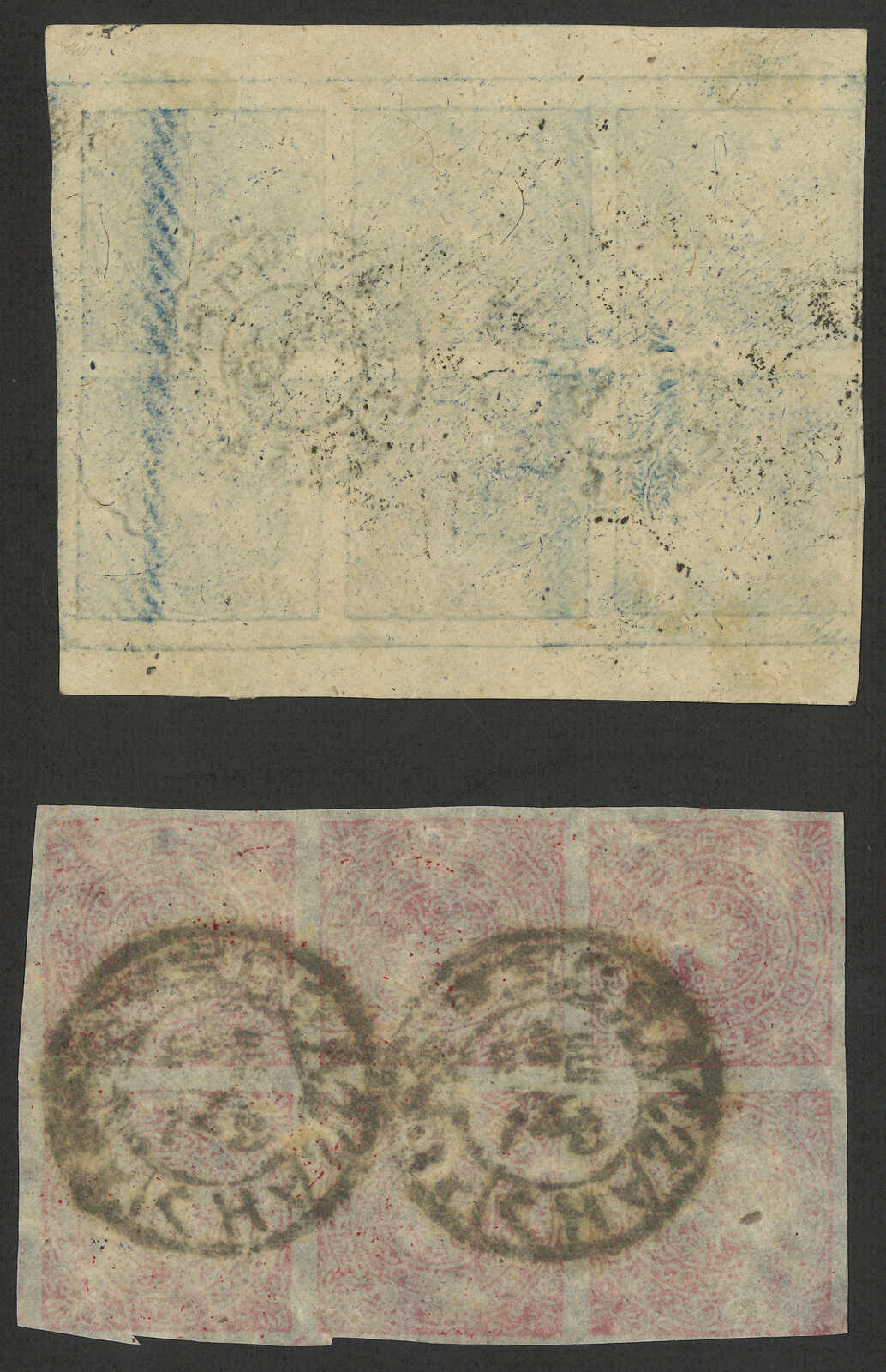 1914年西藏獅圖第二版4章噶不規則三連,帶複印變異。背貼上品。應為1920 年代之晚期印刷。蔡盛及王劍智著《青康藏郵驛史》第254頁圖例原件。(Image 1)