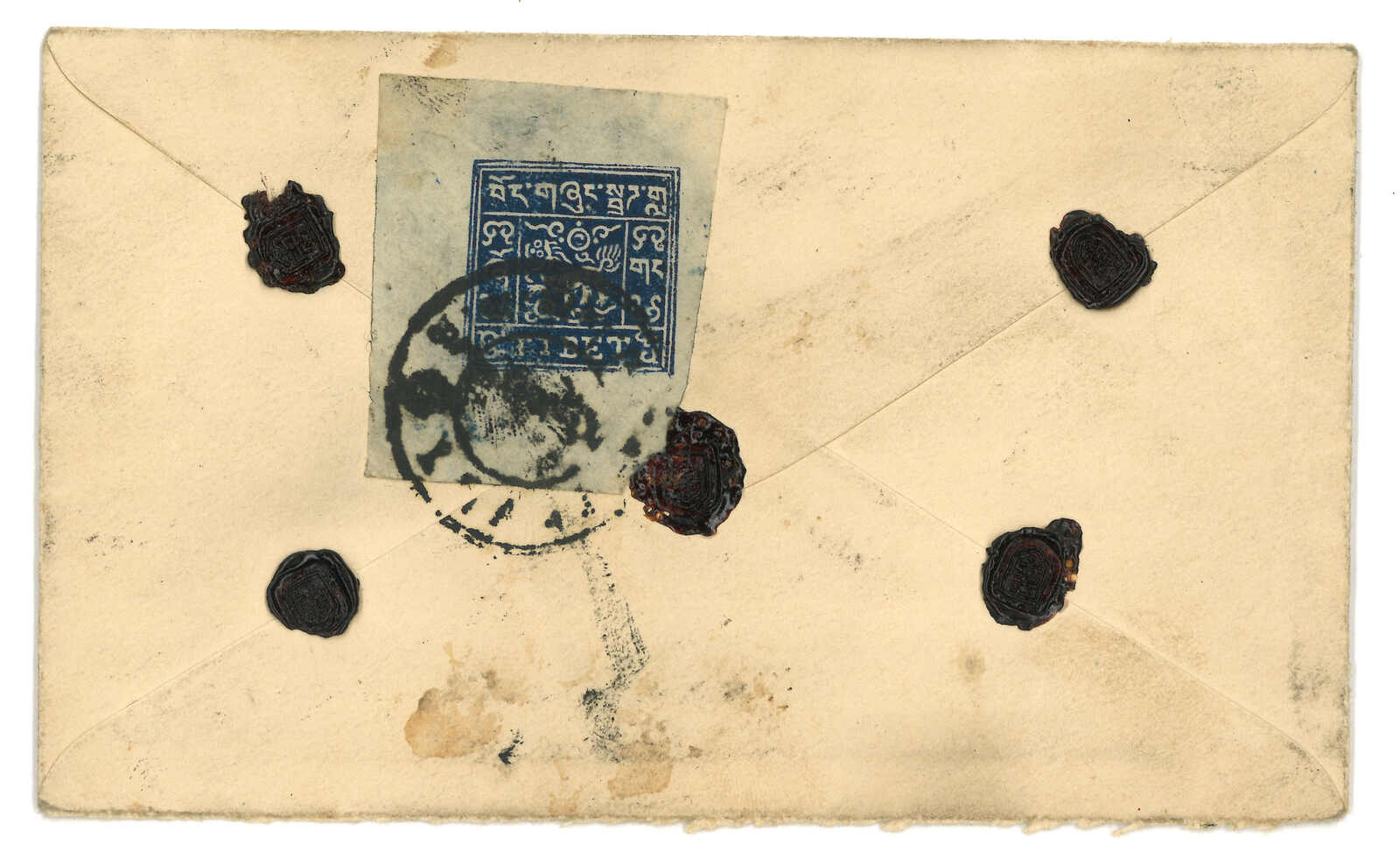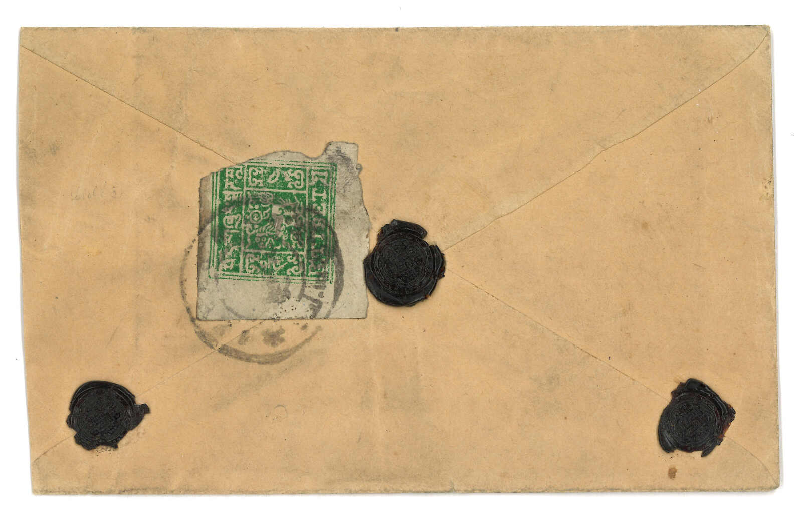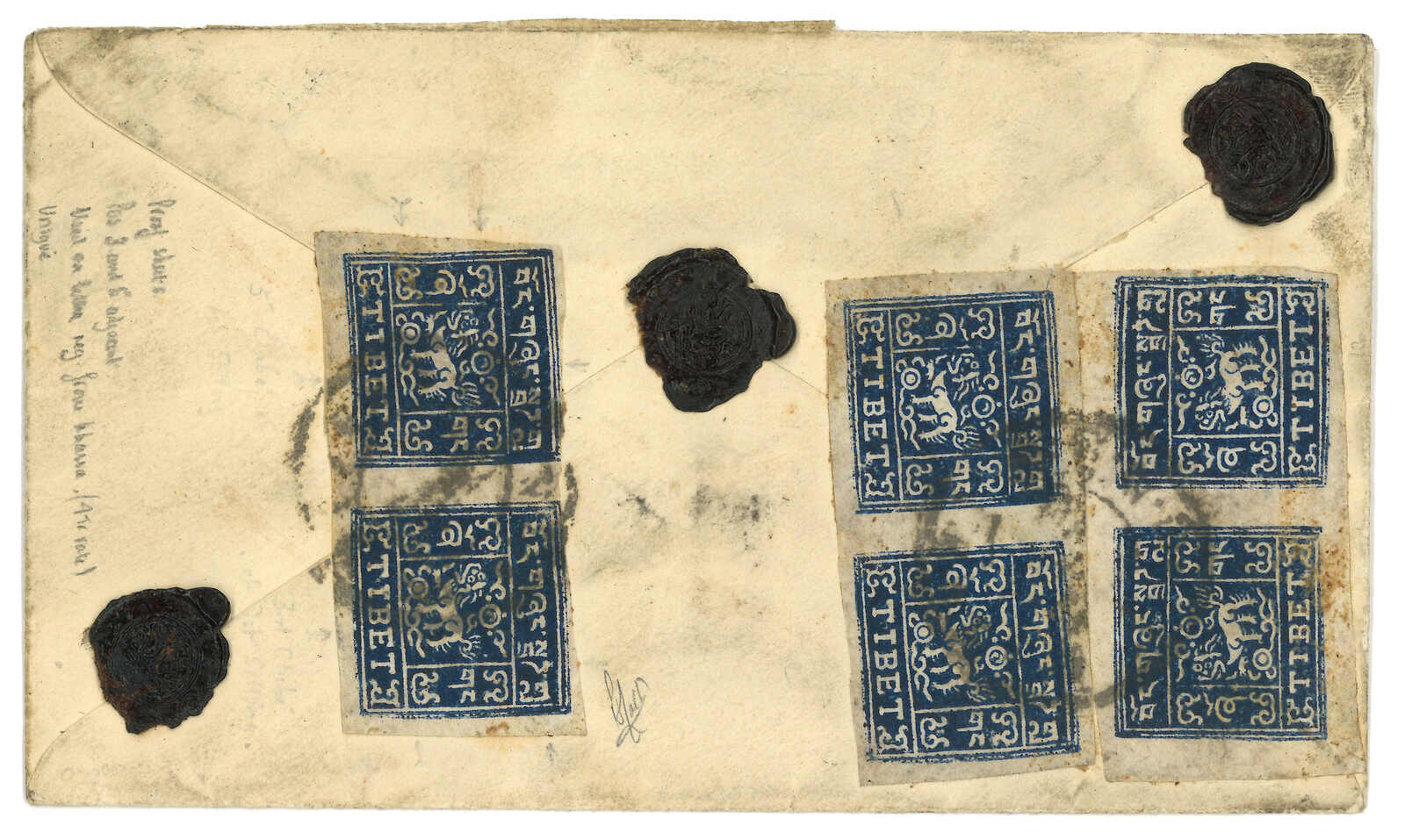 ca 1930s Cover from Lhasa, f.w. Tibet 3rd issue 4tr proof single, tied by Lhasa h.s., alongside with along the wax seal of Prime Minister of Tibet. Scarce cover in term of both franking and wax seal.