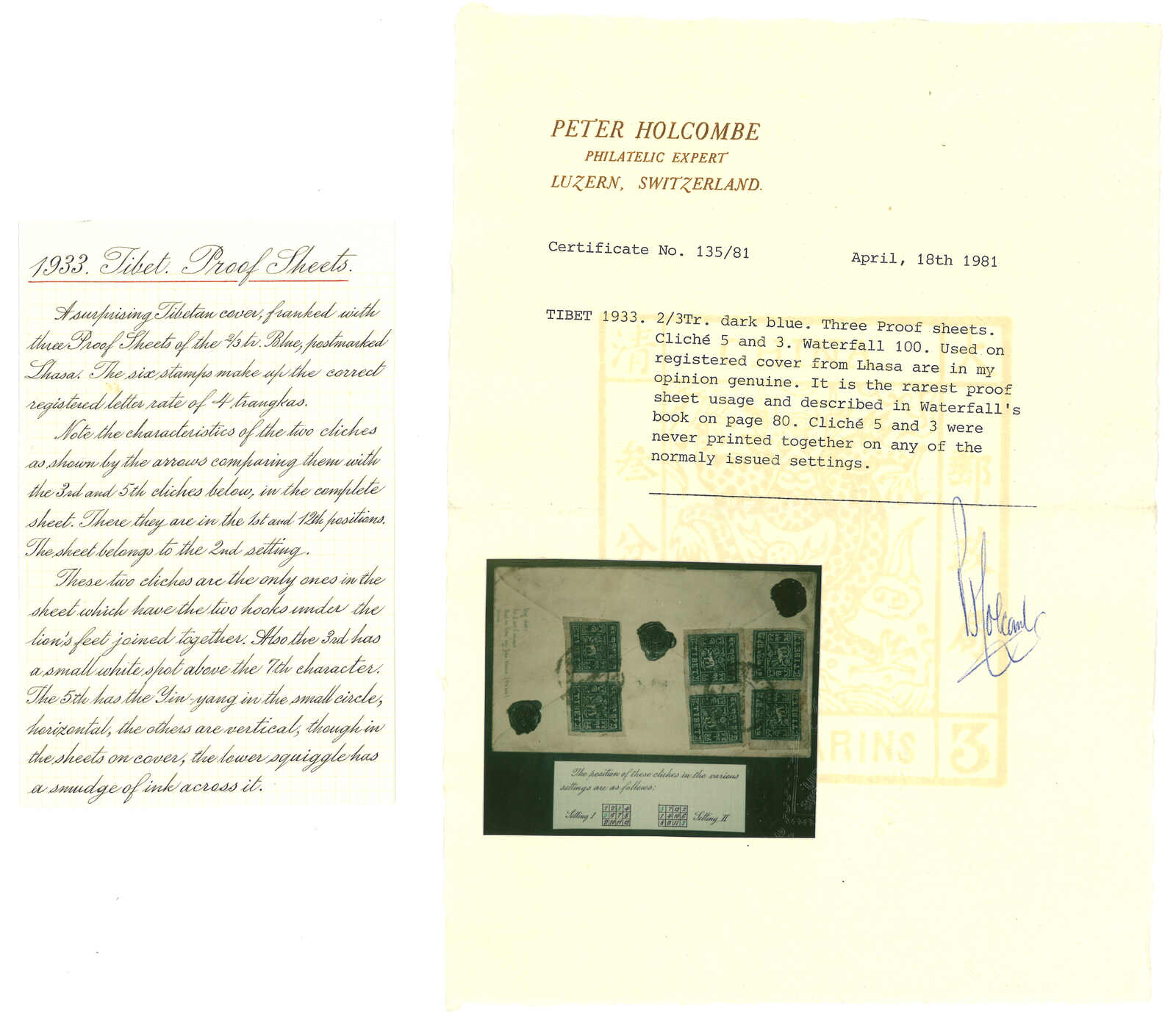 ca 1933 registered cover from Lhasa, f.w. scarce Tibet 3rd issue 2/3tr proof pair x3 on reverse for 4tr registered rate, tied by Lhasa h.s. It is the only known cover f.w. 2/3tr proof stamp. With Peter Holcombe COA.
