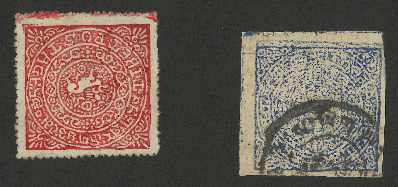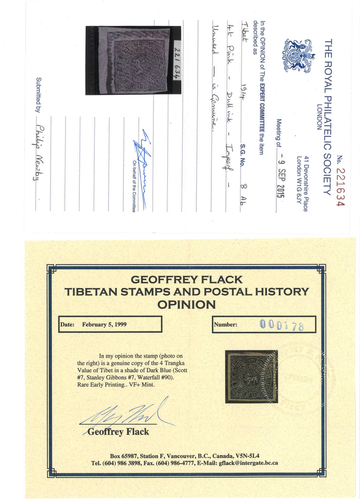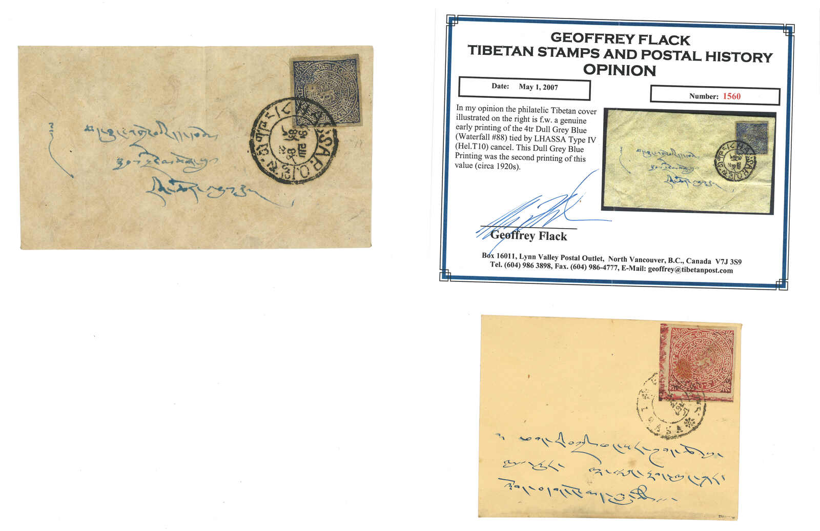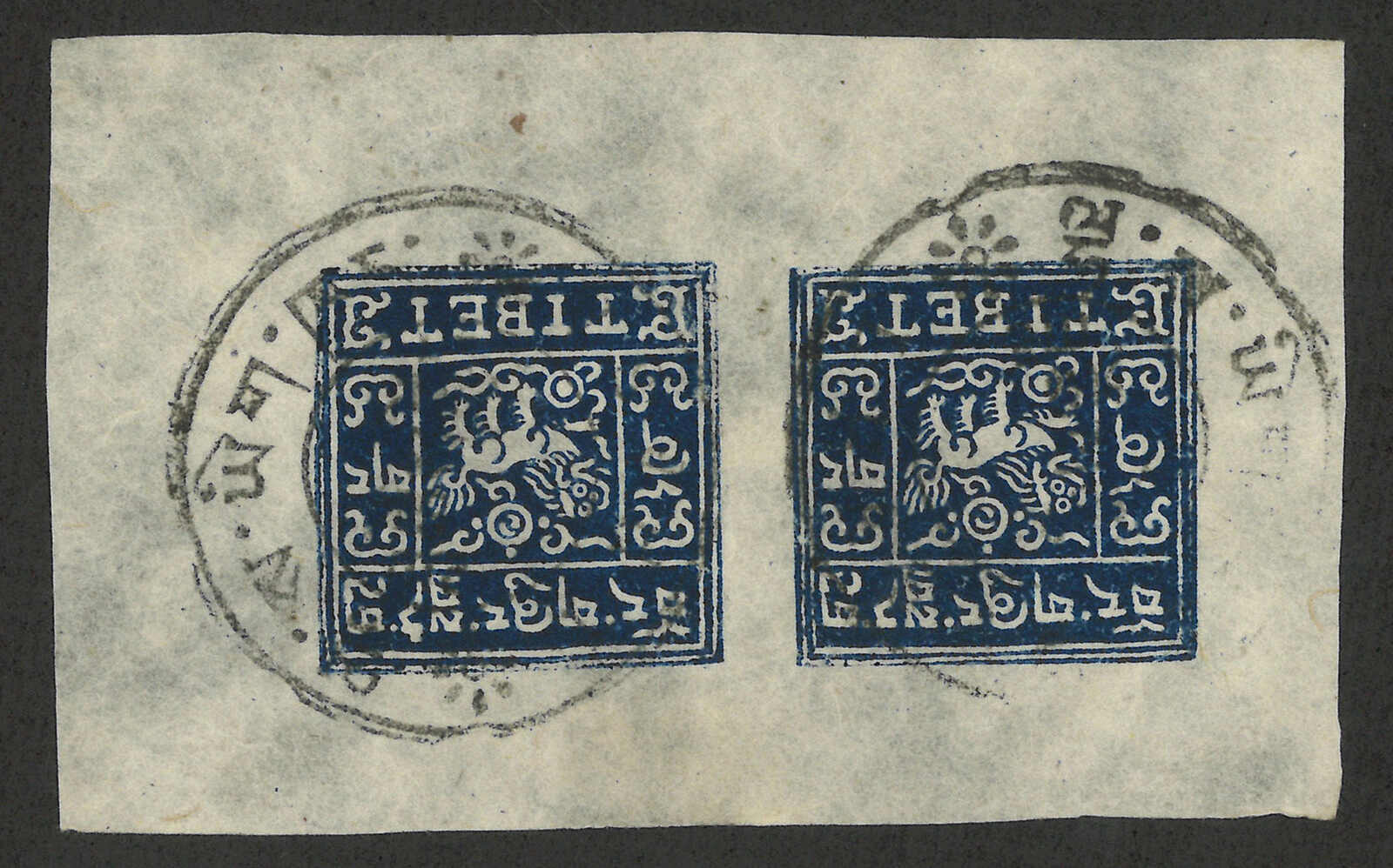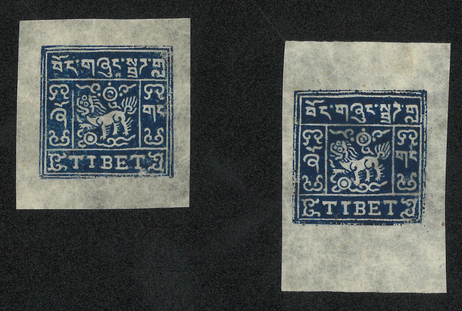 1933 Tibet 3rd issue 2/3tr proof pair, CTO by Lhasa h.s. 1967 (Jan) Robson Lowe, lot 163. Great rarity.