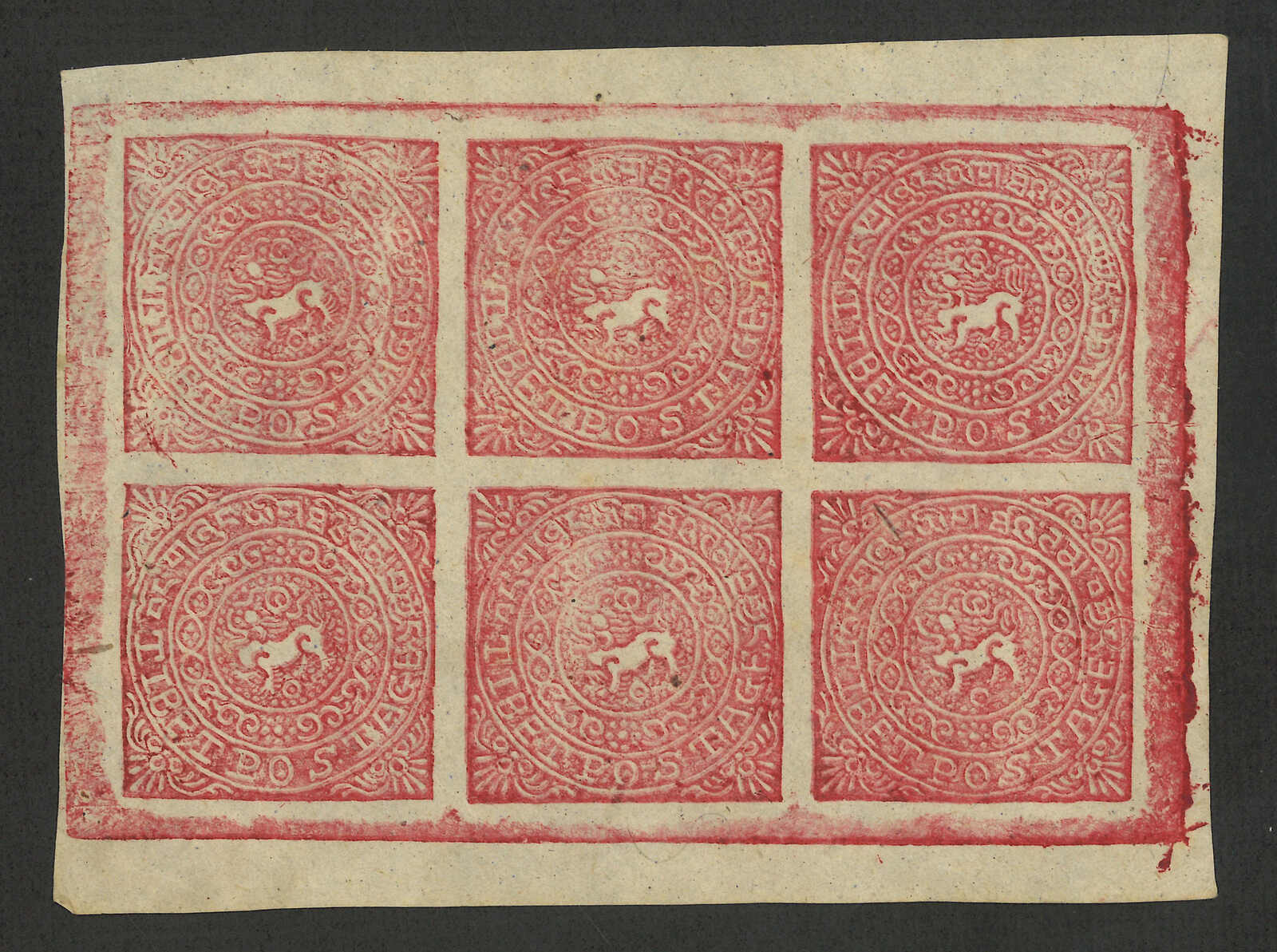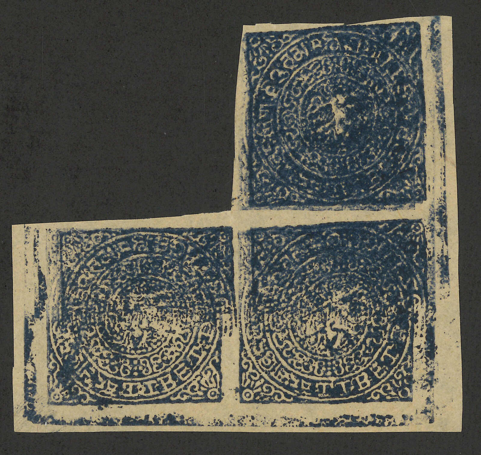 1914 Tibet 2d issue 4tr in irregular block of 3, with double-printing variety. MH. Very Fine. Probably from the late printing in ca 1920. Very scarce. Illustration from “Tibet Stamps and Postal History” by Steven Chazen and