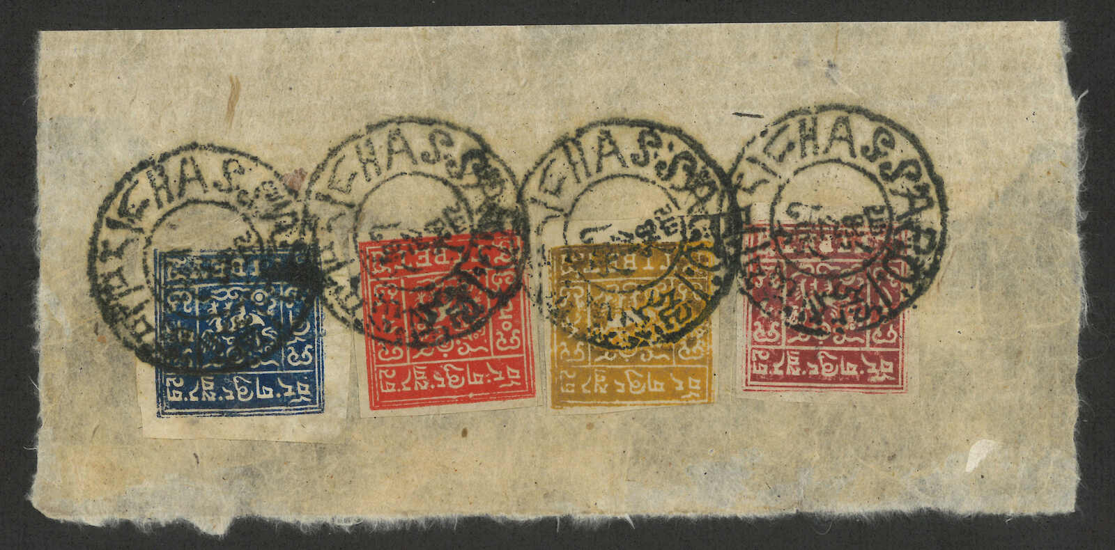 A piece f.w. Tibet 3rd issue single x4, including a 2/3tr proof, tied by Lhasa h.s.