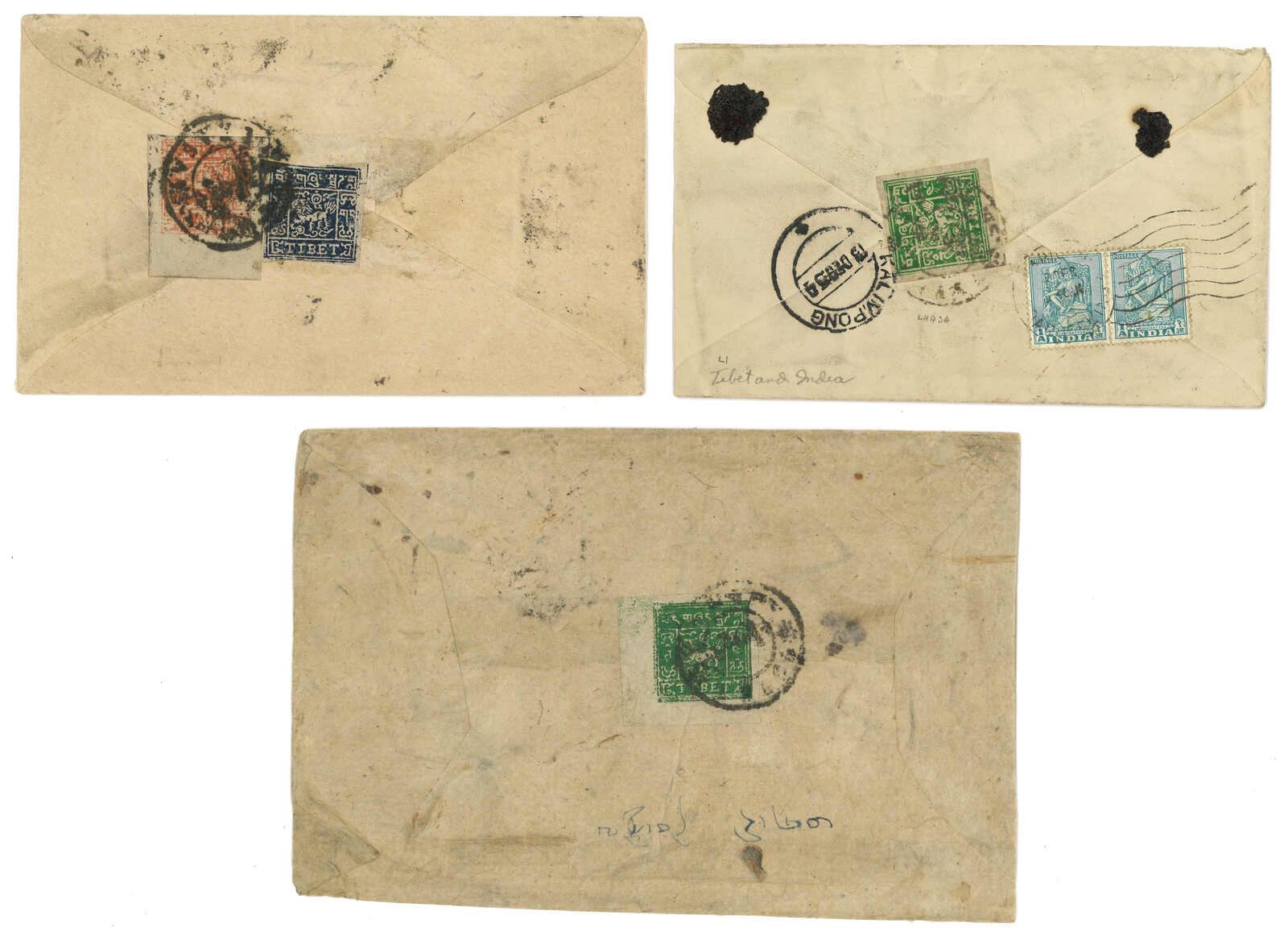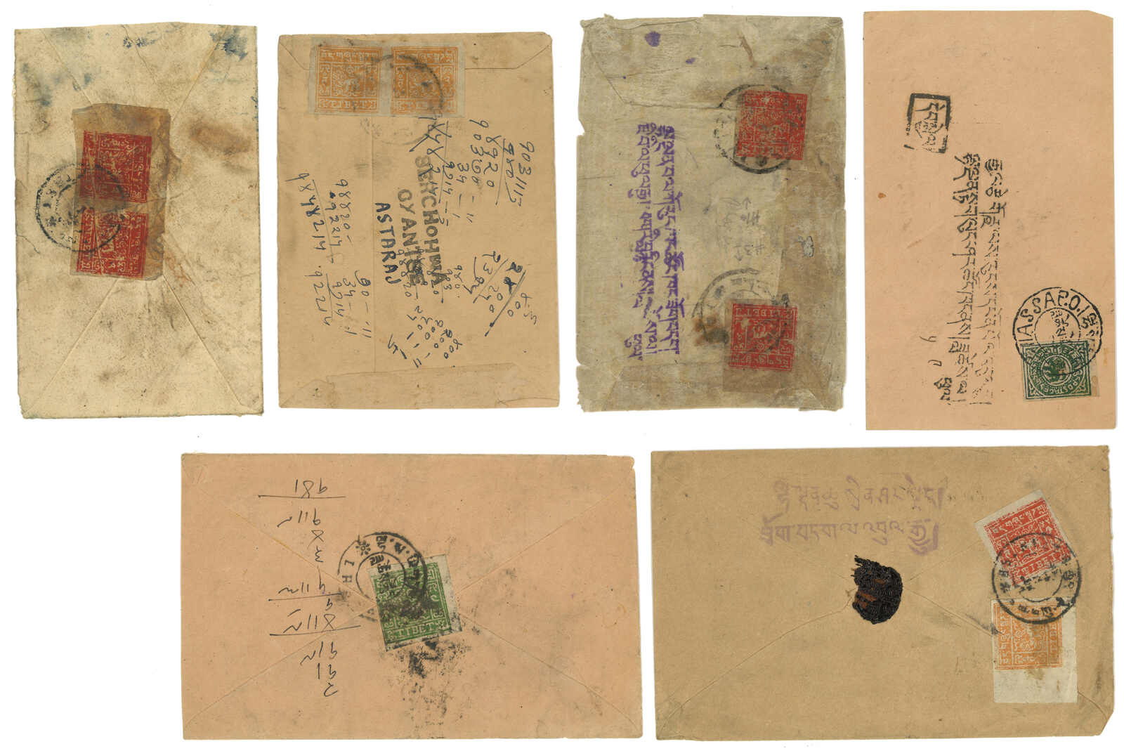 約1950年代一組九件鈐各式指示戳之西藏實寄封,當中一件貼用高面額之第一版1兩票,稀罕難得。(Image 1)