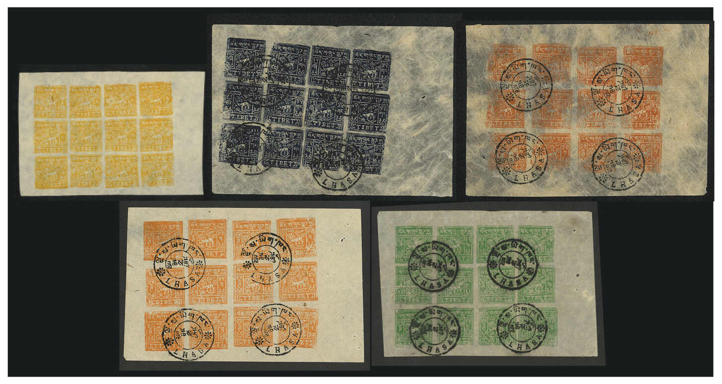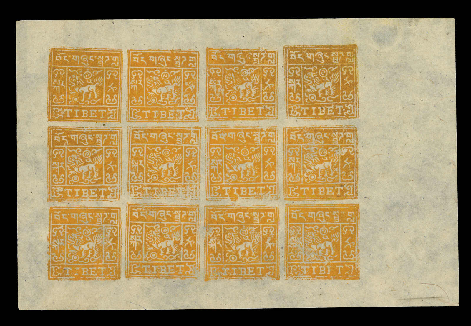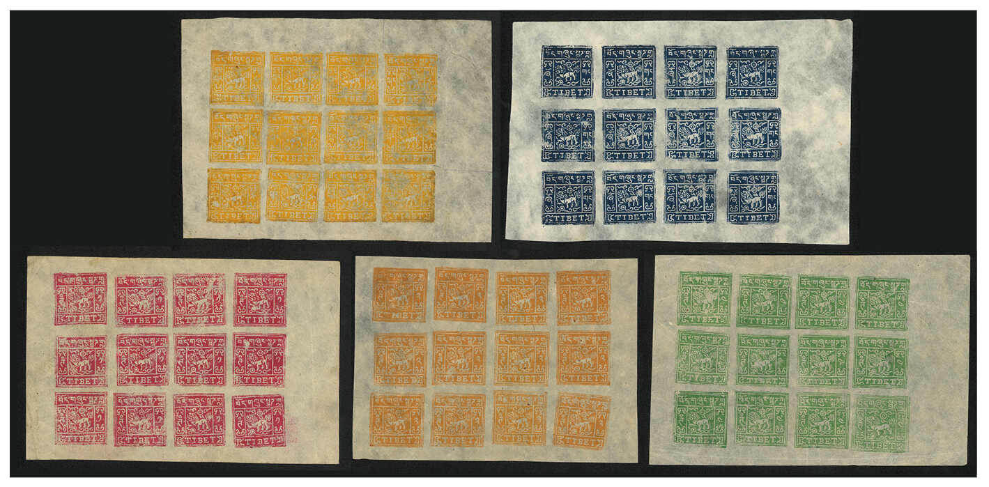 1933年西藏獅圖第三版全套,十二方連5全張,其中4全張為請求加蓋2章噶及4章噶蓋銷拉薩戳記。(Image 1)