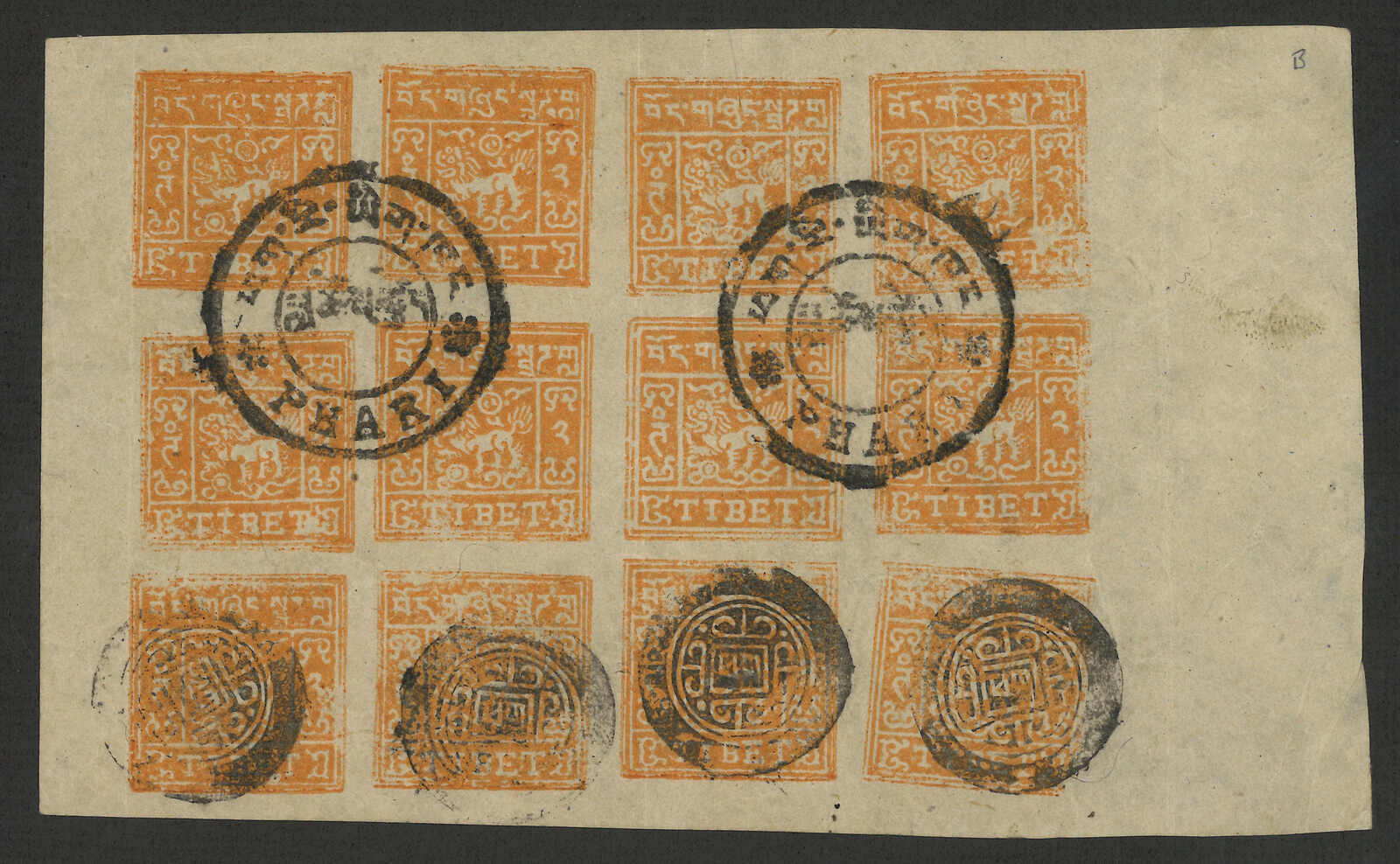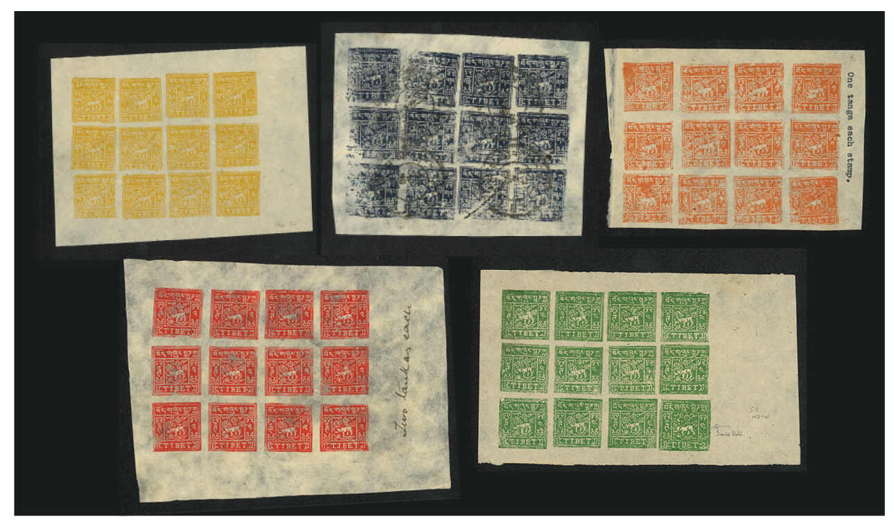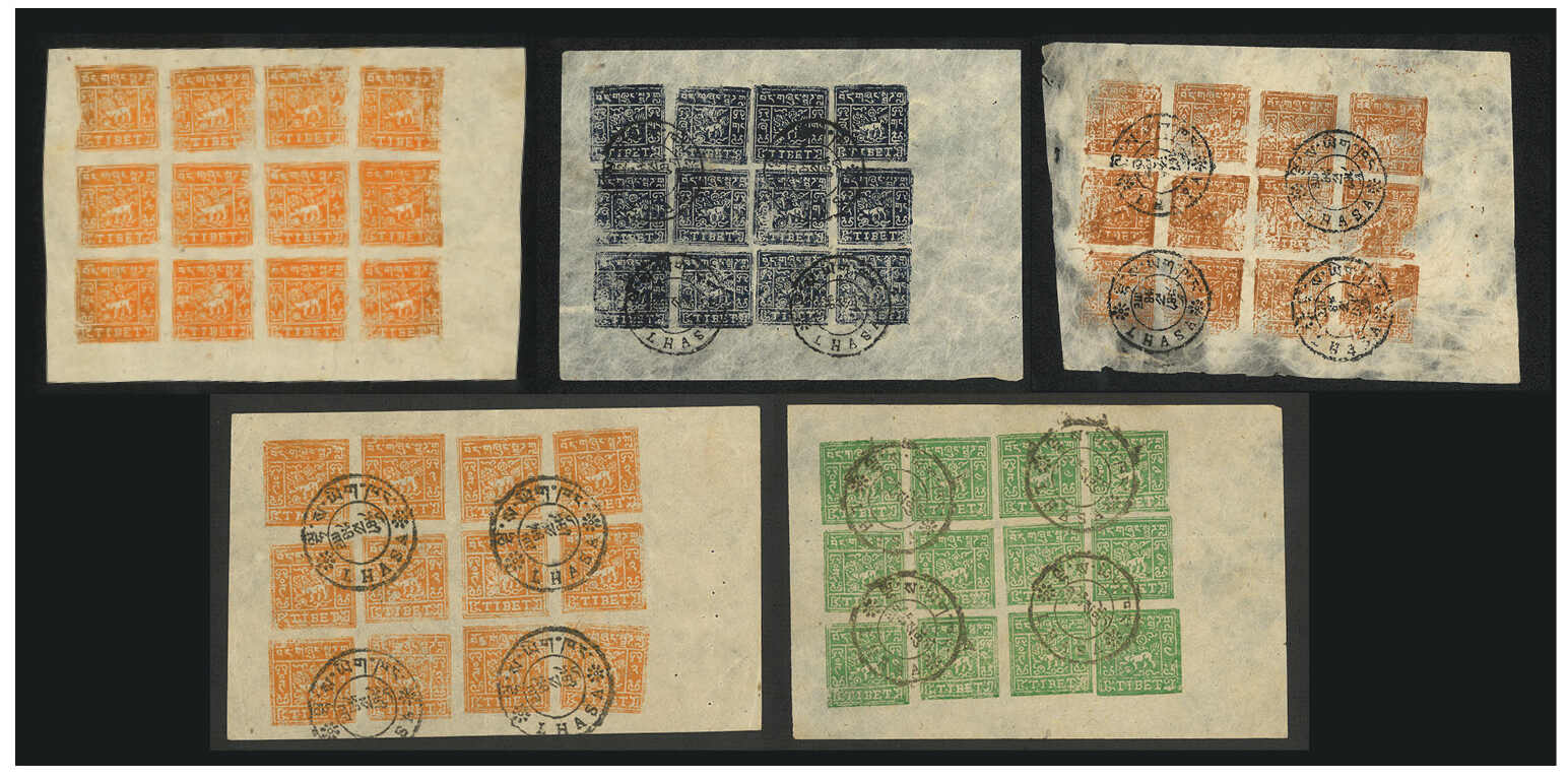 1933年西藏獅圖第三版全套,十二方連5全張,其中4全張為請求加蓋2章噶及4章噶蓋銷拉薩戳記。(Image 1)