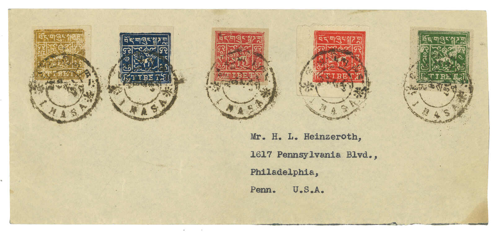 1930s Captain Harry Gantz, Lhasa to USA, f.w. Tibet 3rd issue complete set, tied by Lhasa h.s. Bright colour on the stamps. Probably sent via diplomatic bag. Depsite philatelic, still a beautiful cover.