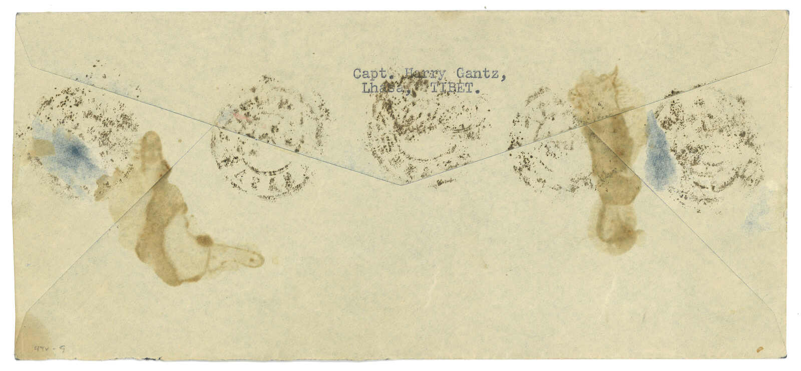 1930年代Captain Harry Gantz寄美國,貼西藏獅圖第三版全,銷拉薩 戳記。郵票色澤亮麗。應由外交郵包送遞。雖為集郵封,但漂亮悅目。(Image 1)