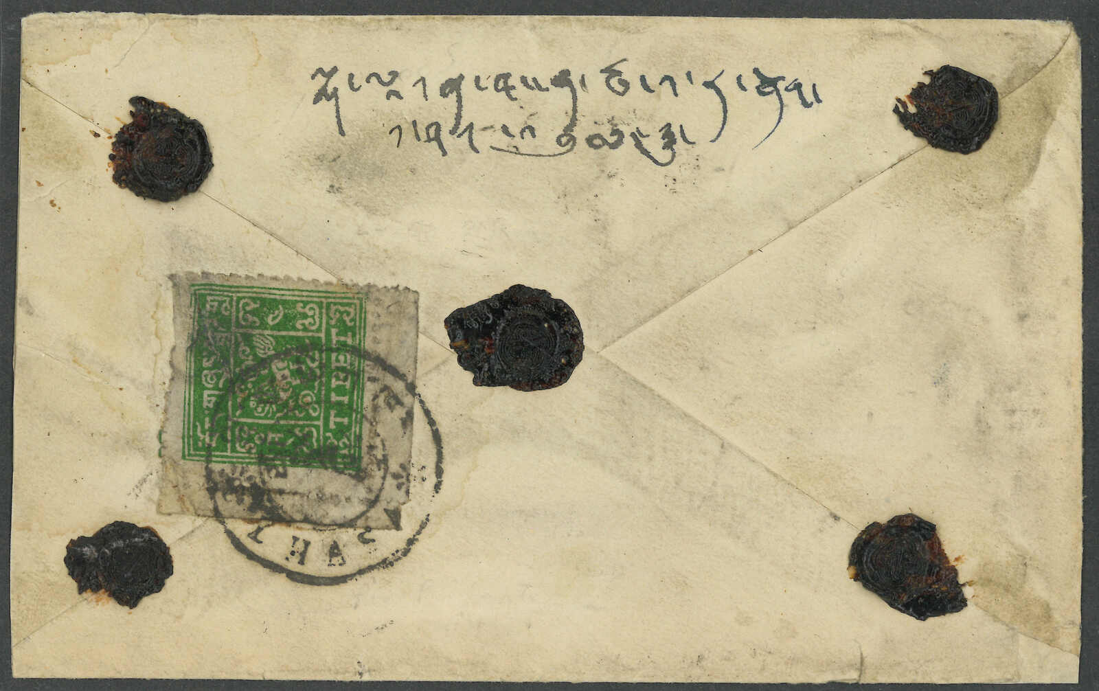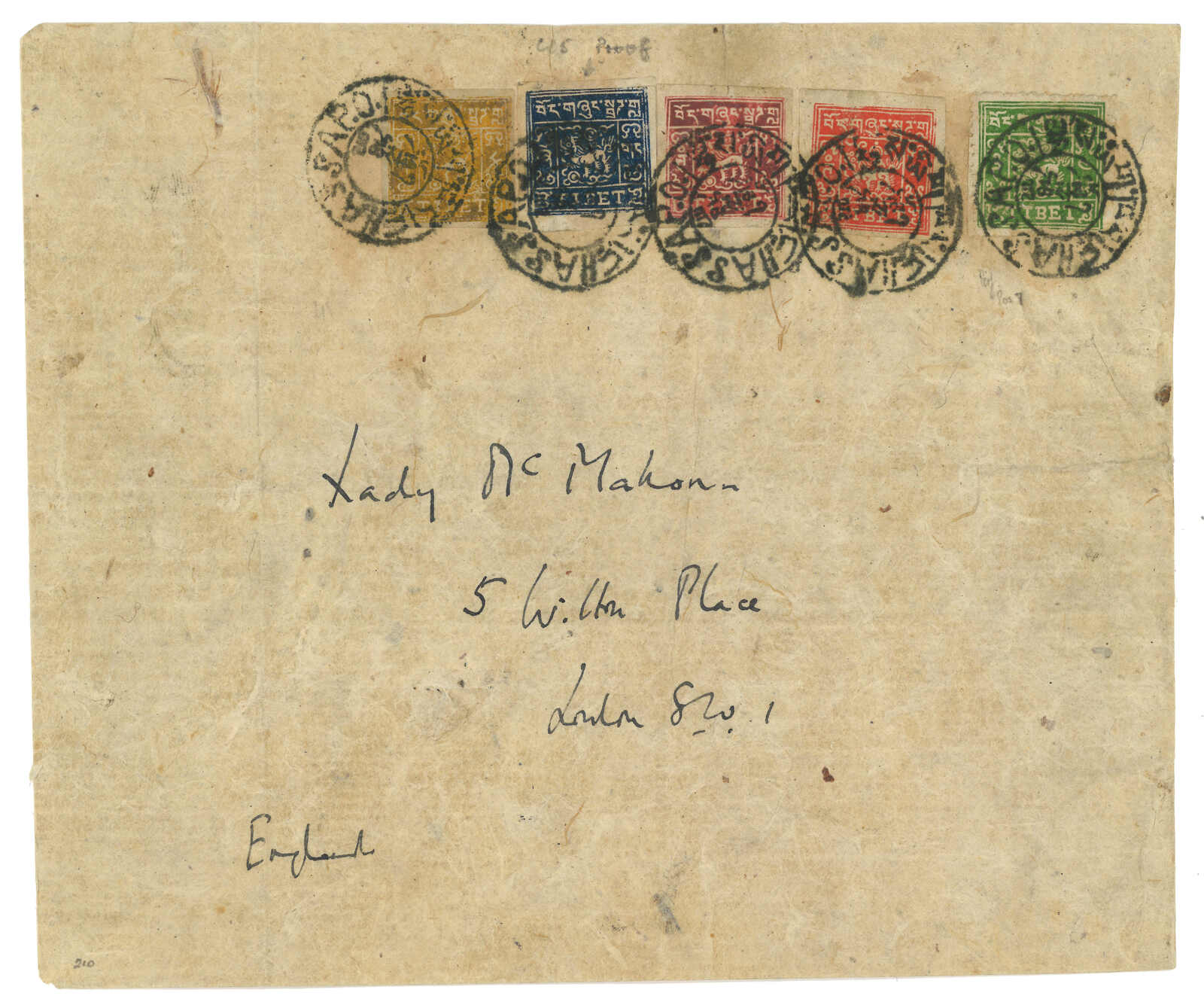 1936由錫金專員Basil Gould寄英國,貼西藏獅圖第三版全(當中4章噶票有齒),銷拉薩戳記。 此信出自1936年Gould出訪西藏爭取可於拉薩常駐代表期間,經外交郵包送遞。(Image 1)