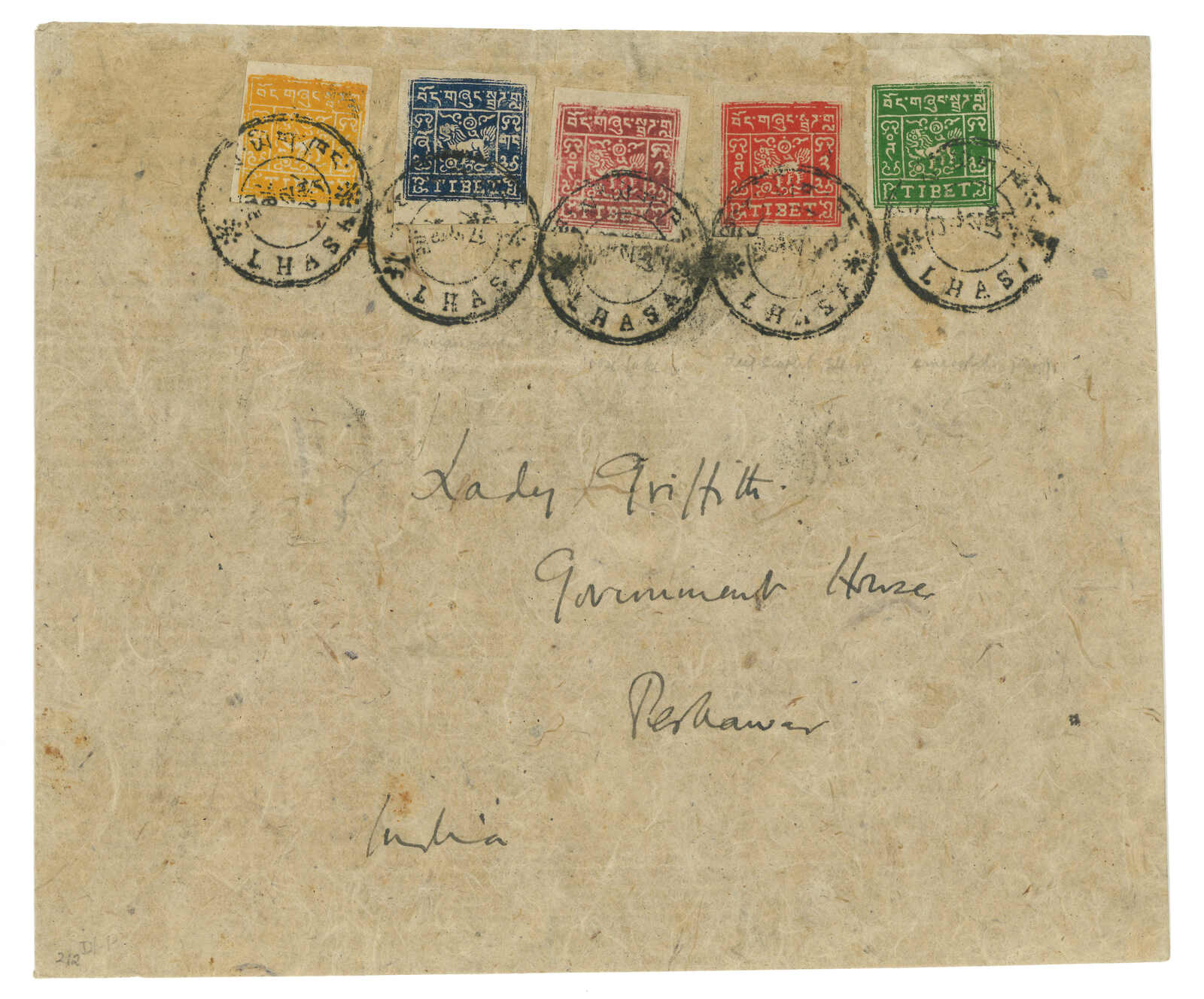 1936 British Mission to Lhasa to Lady Griffith, Peshawar, India, f.w. TIbet 3rd issue complete set in which 4tr perforated, tied by Lhasa hs. Lady Griffith was the wife of Sir Ralph Griffith, the Governor of North West Frontier