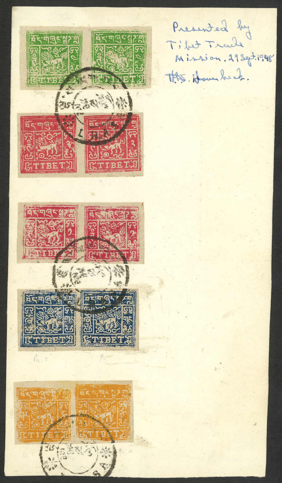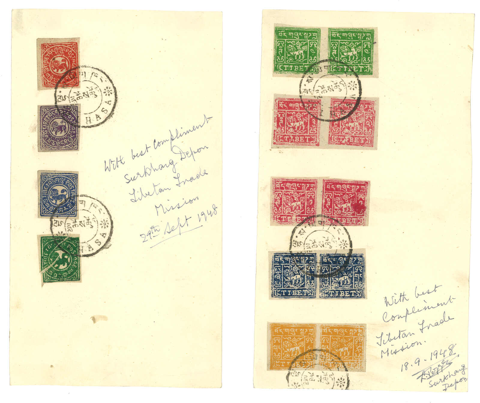 1948 a pair of presentation sheets of the Tibetan Trade Mission visiting Europe and USA. Two sheeets f.w. Tibet 1st single and 3rd issue horizontal pair respectively, tied by Lhasa h.s, alongside with Surkhang Depon signature.