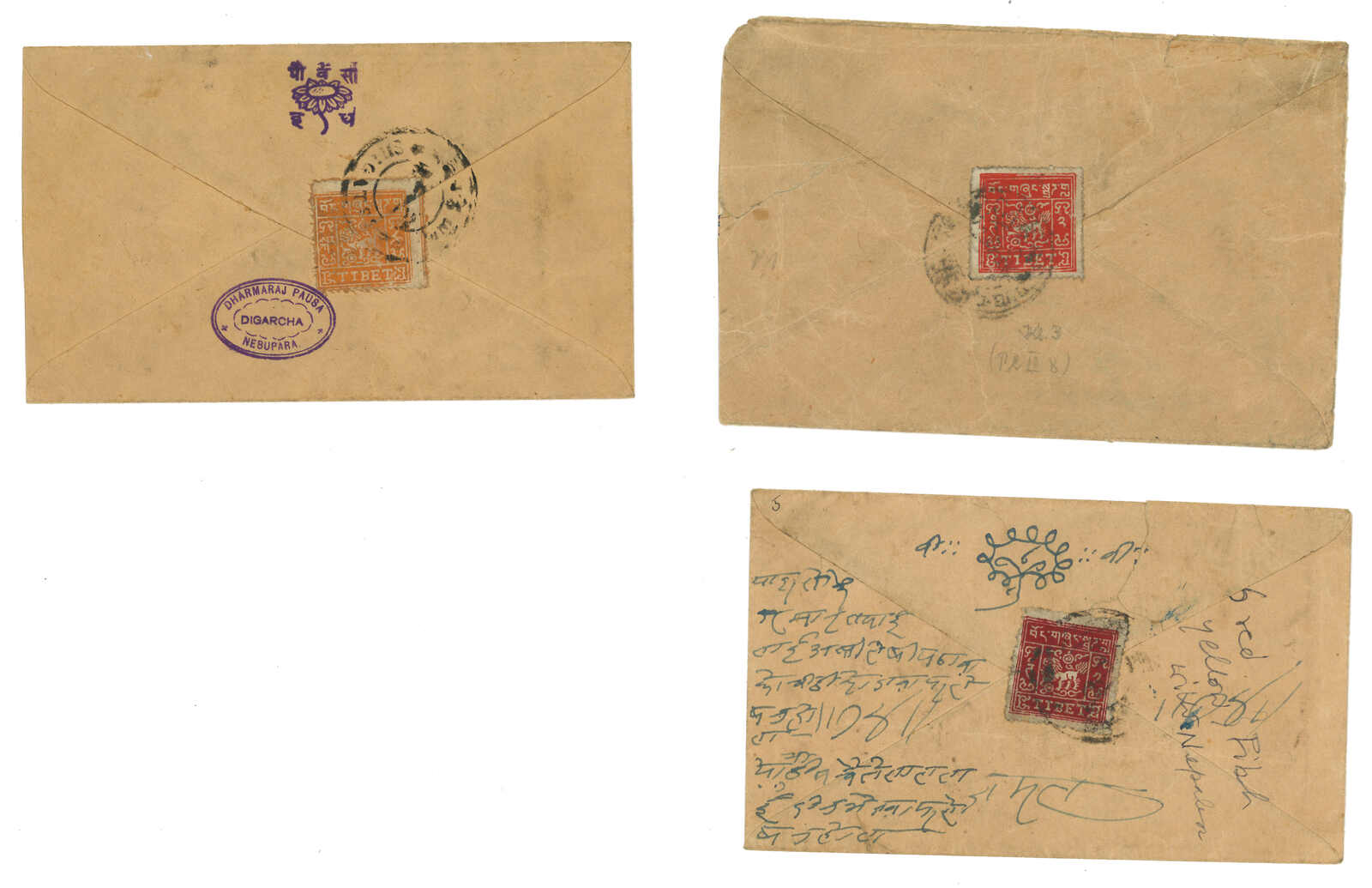一組三件貼用西藏獅圖第三版有齒票之實寄封,分別單貼1/2章噶、1章噶及2章噶,十分稀罕難得。(Image 1)