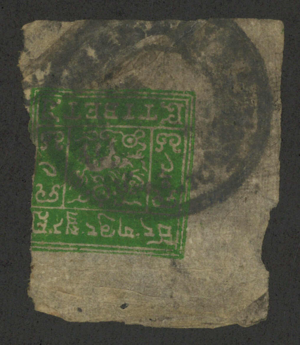 1930年代拉薩封,貼西藏獅圖第三版黃綠色有齒4章噶,銷拉薩戳記。Waterfall指黃綠刷色屬首批印刷,有齒更是難得。(Image 1)