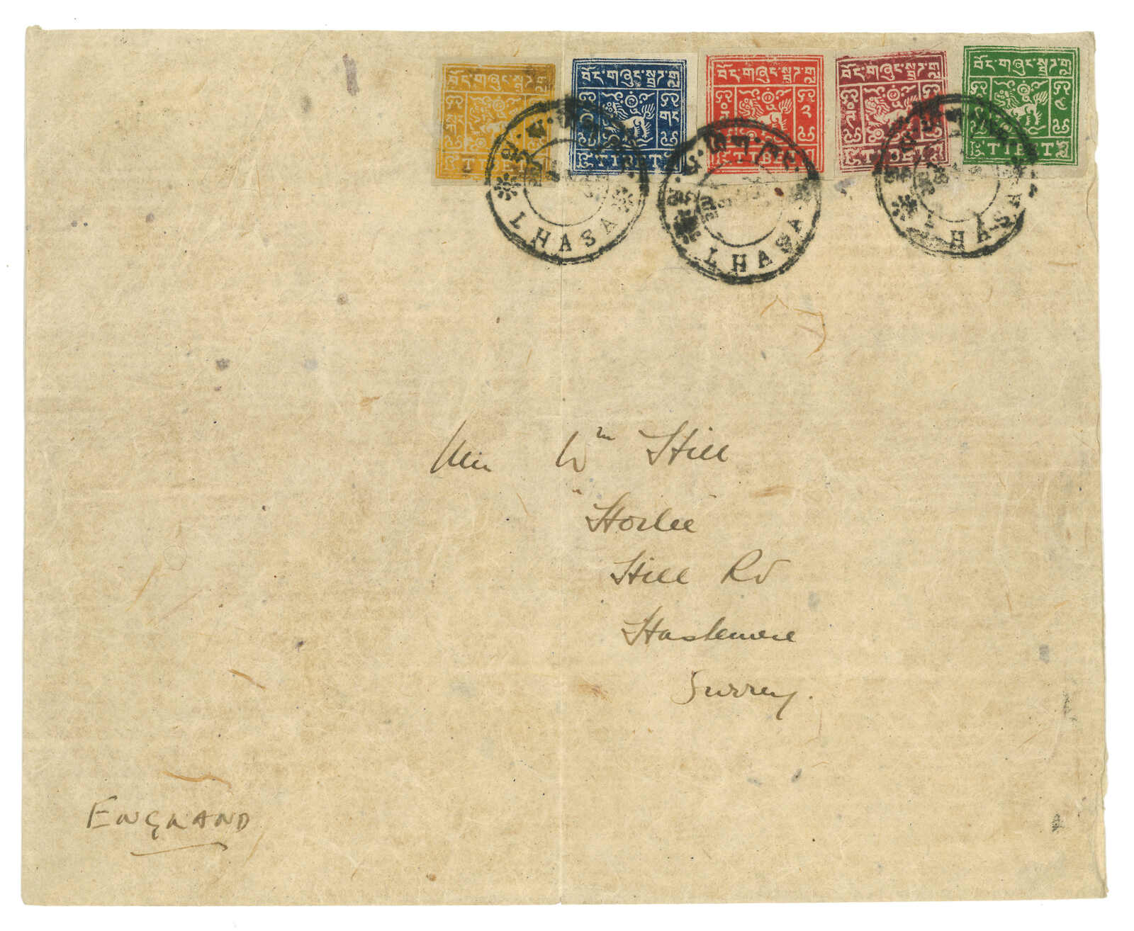 1936 Basil Gould, Political Officer in Sikkim to England, f.w. Tibet 3rd issue complete set (including perforated 4t), tied by Lhasa h.s. Originating from the 1936 Mission to the Tibetan Regent, this mail was sent by diplomatic