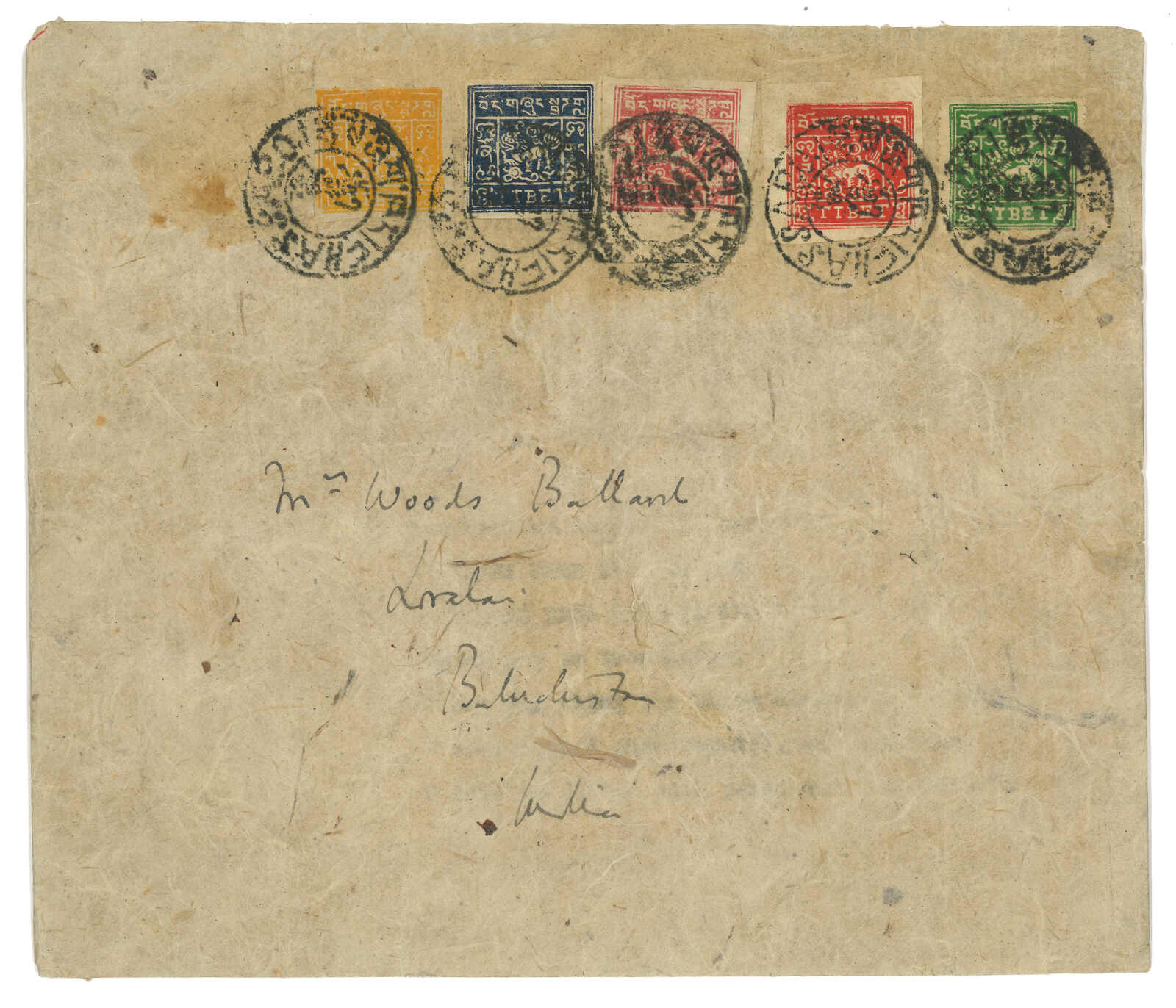 1936 Basil Gould, Political Officer in Sikkim to Woods Ballant, Indian Political Service, Baluchistan, India, f.w. Tibet 3rd issue complete set (including perforated 4t), tied by Lhasa h.s. Originating from the 1936 Mission to