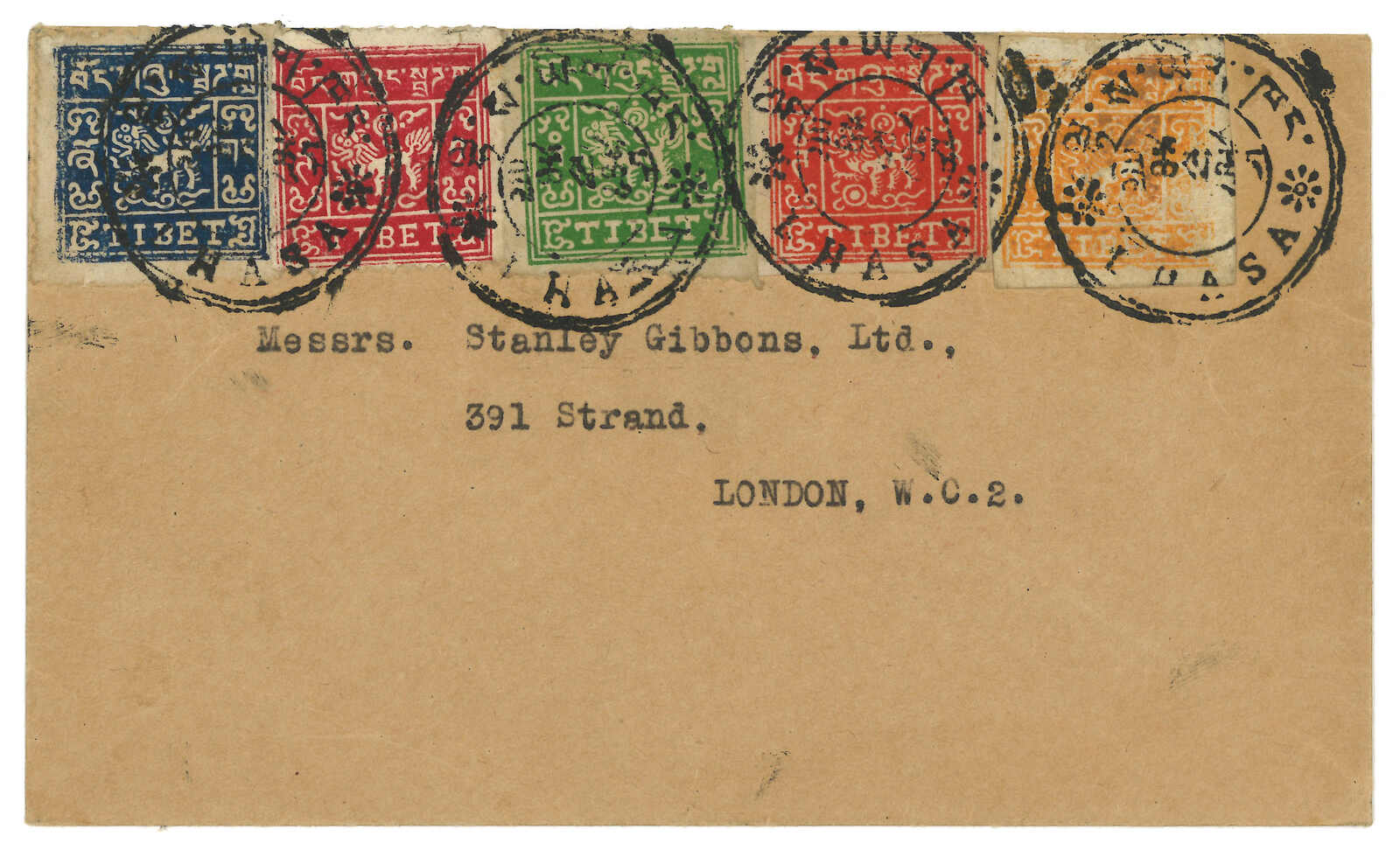 1930s a pilatelic cover from Lhasa to Stanley Gibbons, London, f.w. Tibet 3rd issue first printing complete set in which 2/3tr, 1tr and 4tr perforated, tied by Lhasa h.s.