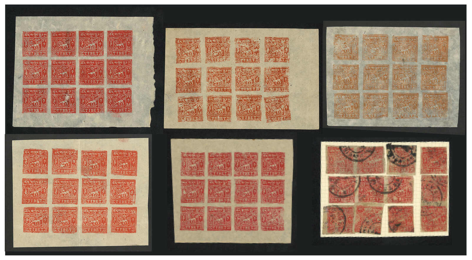1933年西藏獅圖第三版1章噶,十二方連5全張和一版重組全張,早期及晚期印刷及顏色變異。(Image 1)