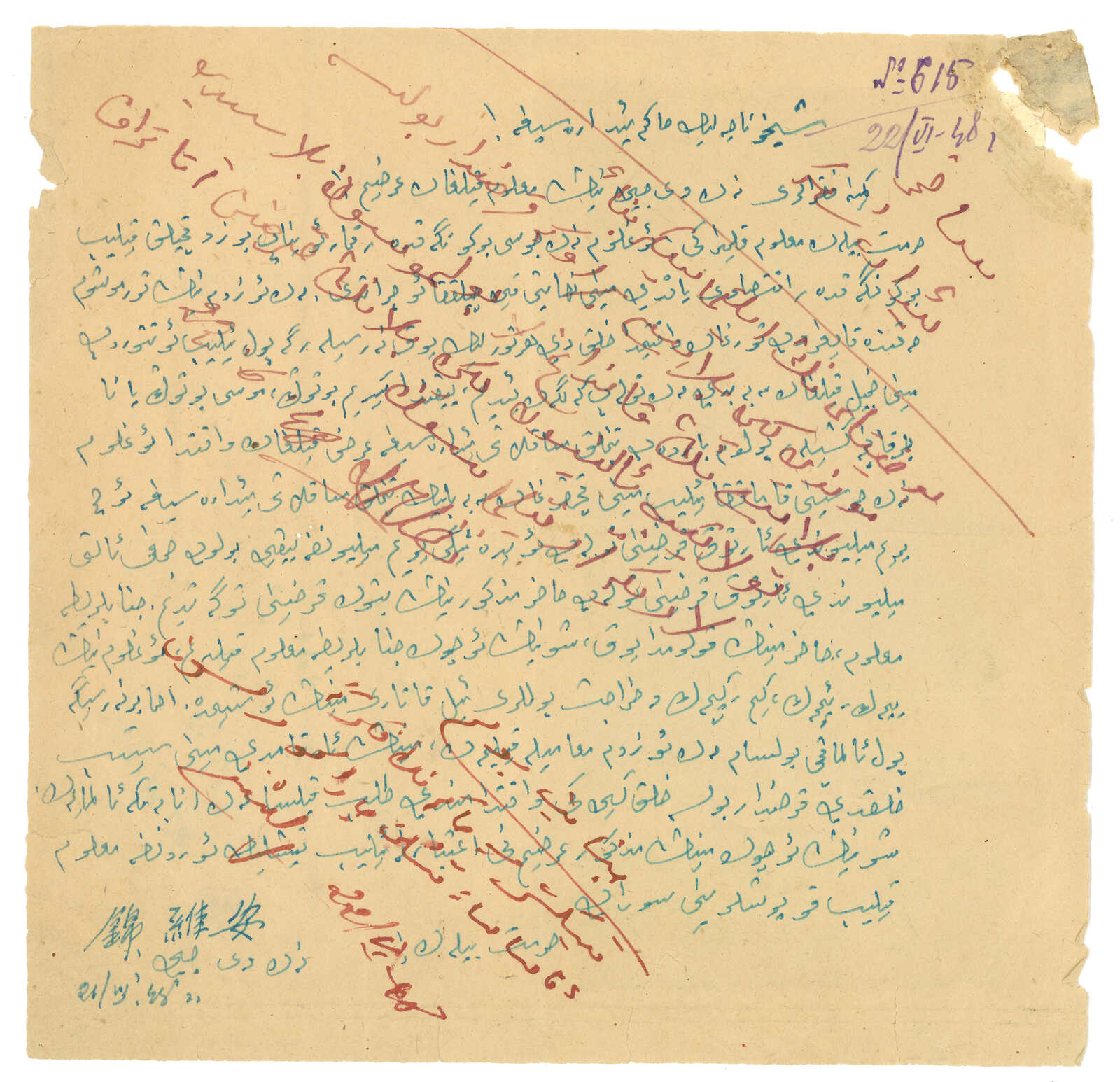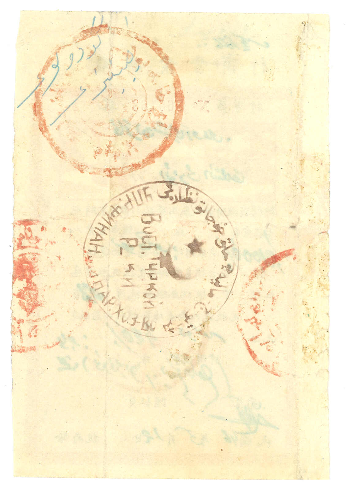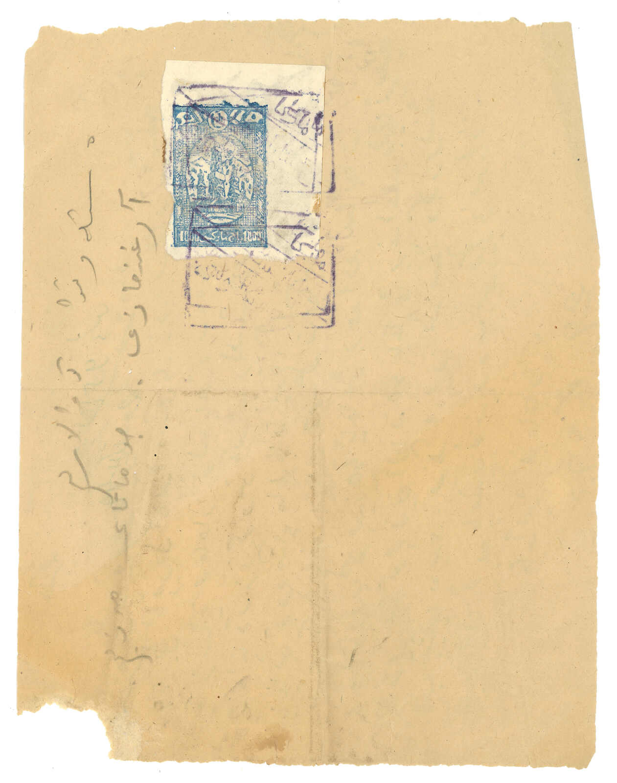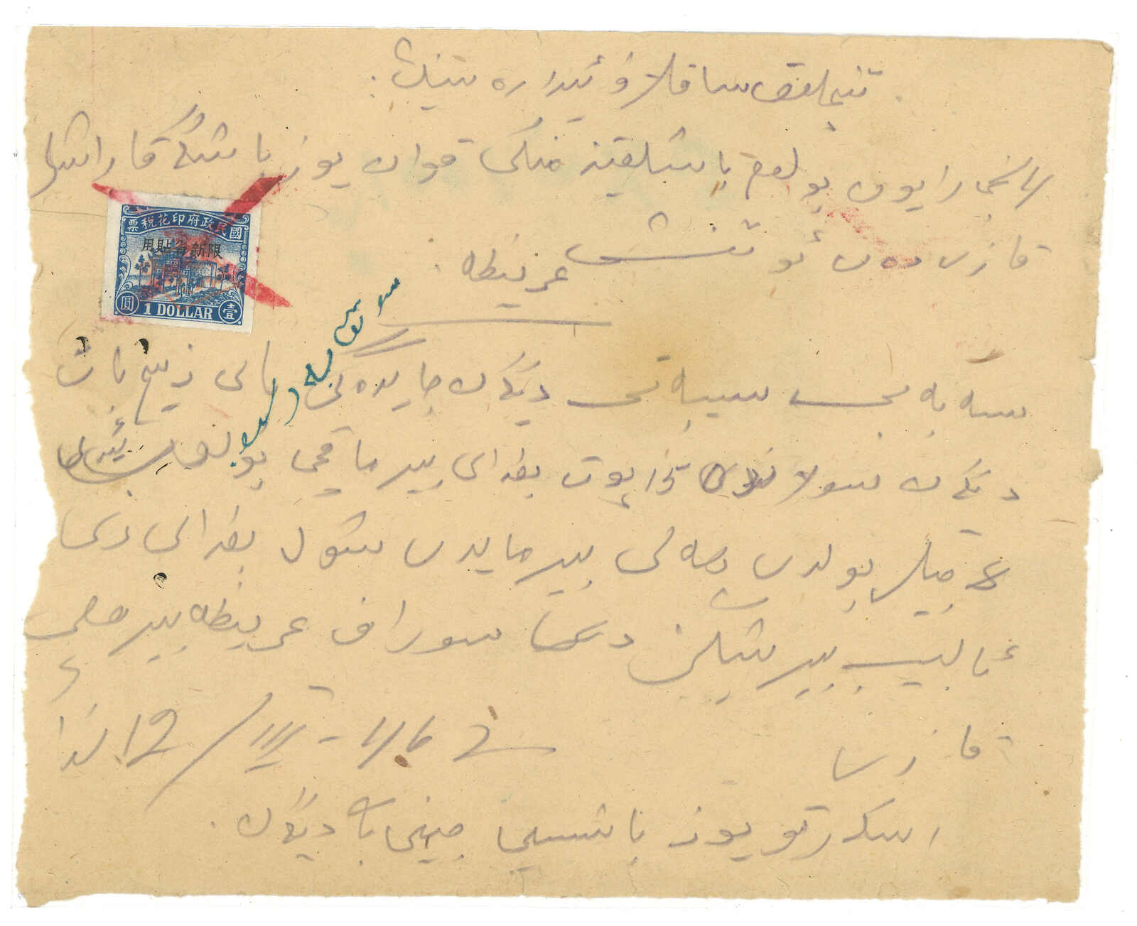 ca 1945 a petition letter f.w. Tacheng ovpt. on Futuguan Revenue Stamp $1, tied by red cross. In 1945, East Turkestan Republic overprinted on ROC postage and revenue stamps with character “National Bank” in Uygur. These
