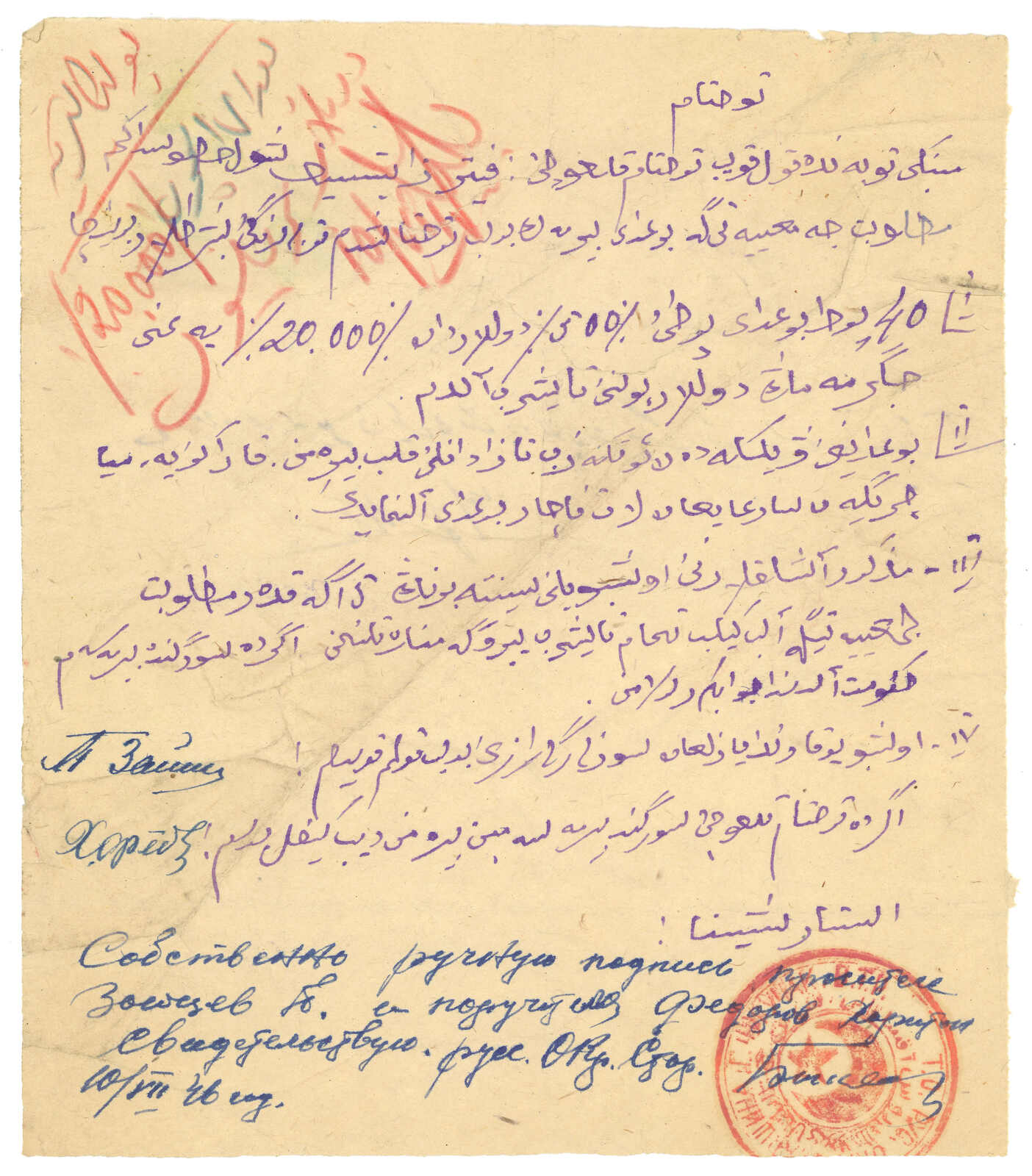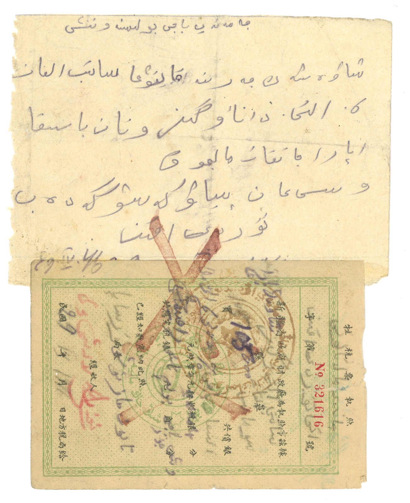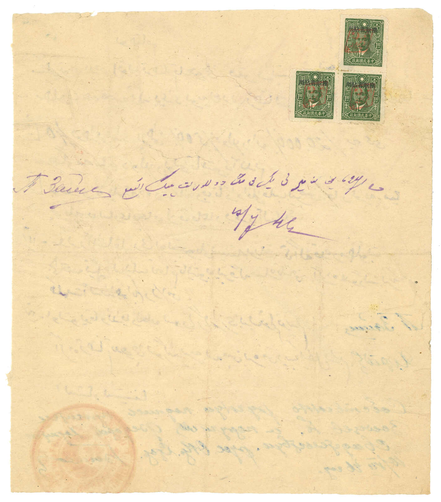 1948 (2 Aug) petition letter, attached with a receipt f.w. East Turkestan Republic construction issue $1000, tied by Ugyhur rectangular h.s. Rare.