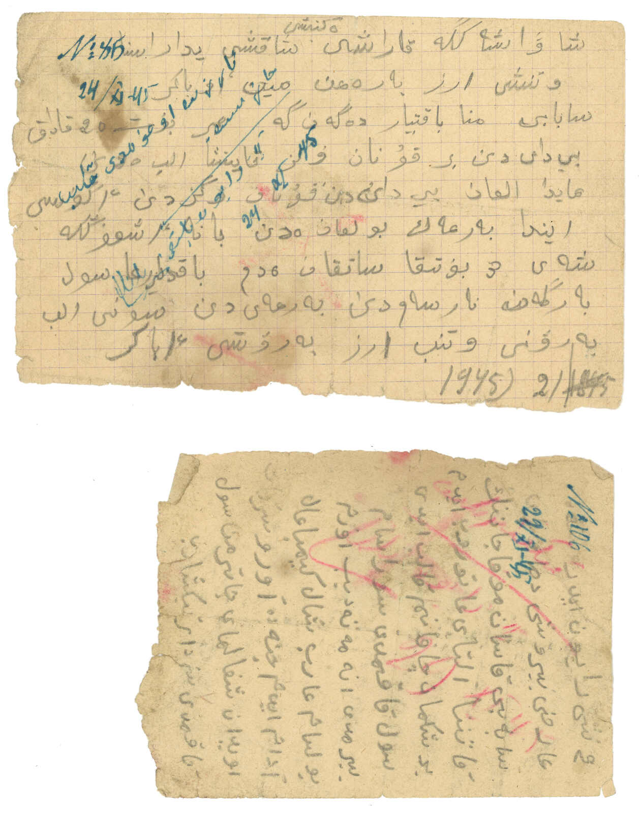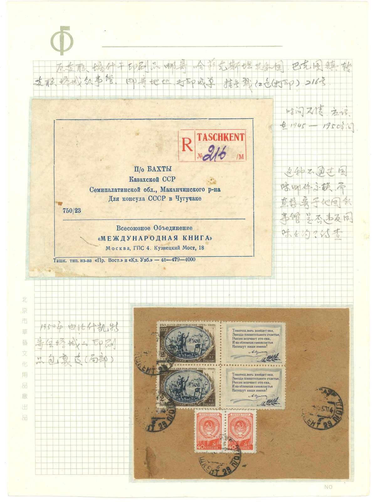 1940至1950年代三區革命時期一對蘇聯塔什干寄蘇 聯駐塔城領使館之宣傳品包裹單及剪片。(Image 1)