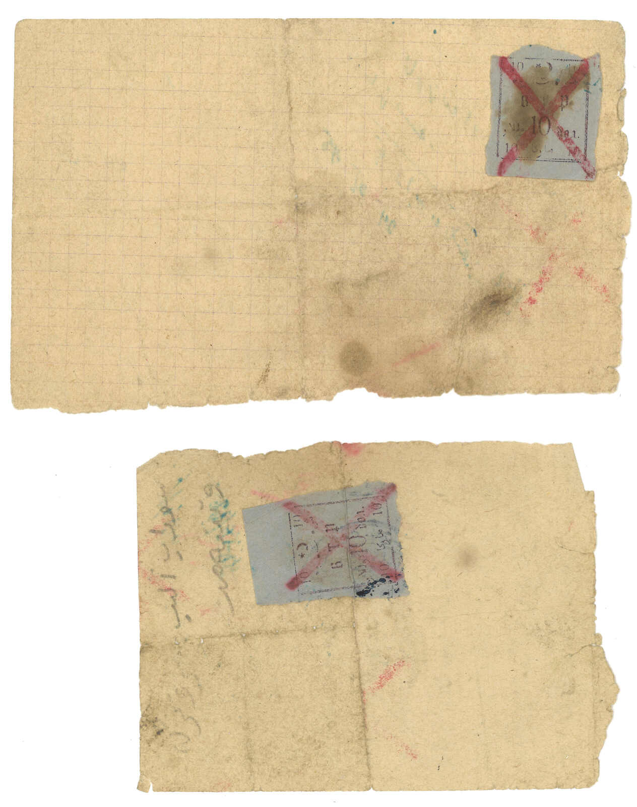 約1945年一件貼用塔城加蓋票之上訪信,原票為復興關加蓋限新省貼用印花稅 票1元,以紅叉蓋銷。1945年,三區臨時政府在民國郵票及印花稅票上加蓋改 作郵、稅兩用票。此票一直不為人所知,直至1947年張庚伯才有所介紹。(Image 1)