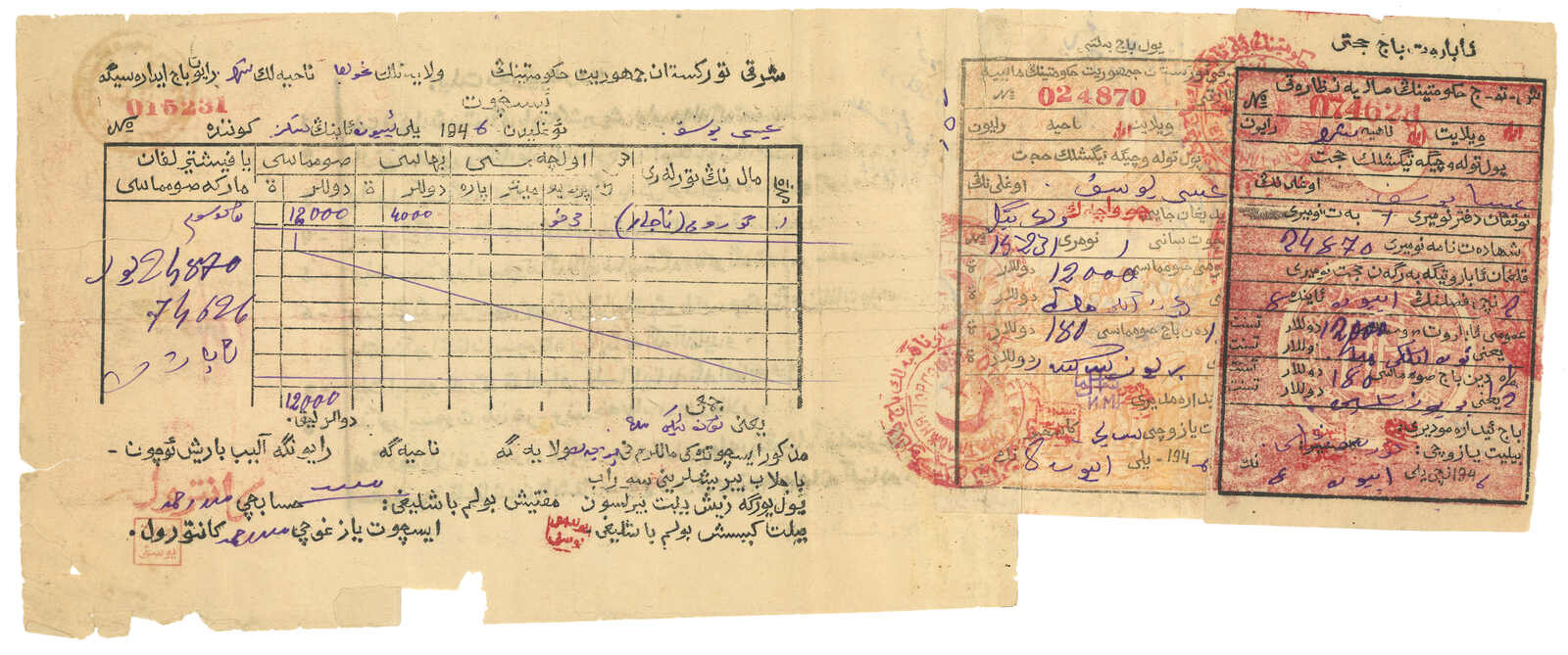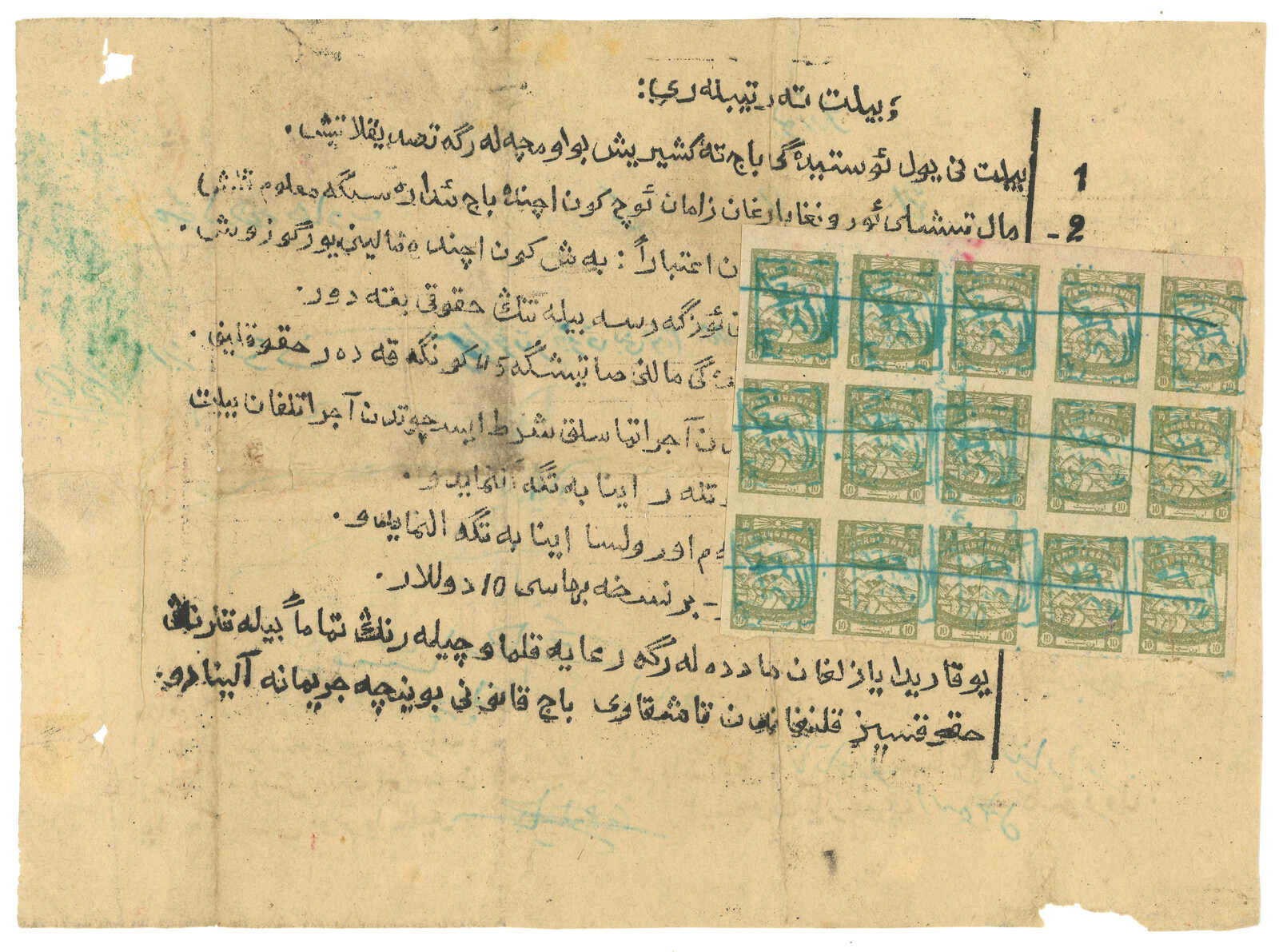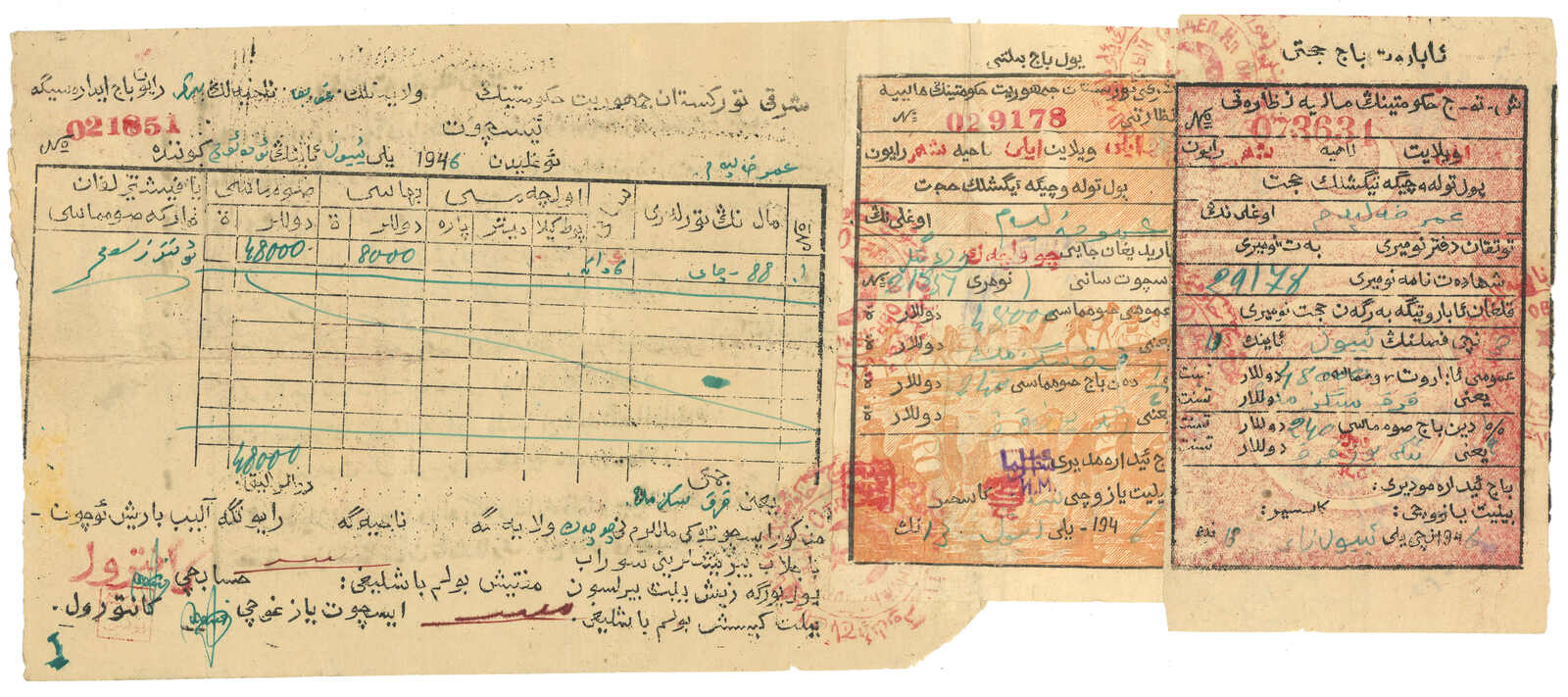 ca 1945 a receipt f.w. Kuldja ovpt. on Sinkiang revenue stamp 10c in block of 15, tied by pen stroke. In 1945, East Turkestan Republic overprinted on ROC postage and revenue stamps with character “National Bank” in Uygur. These