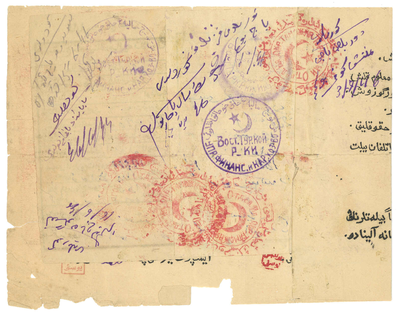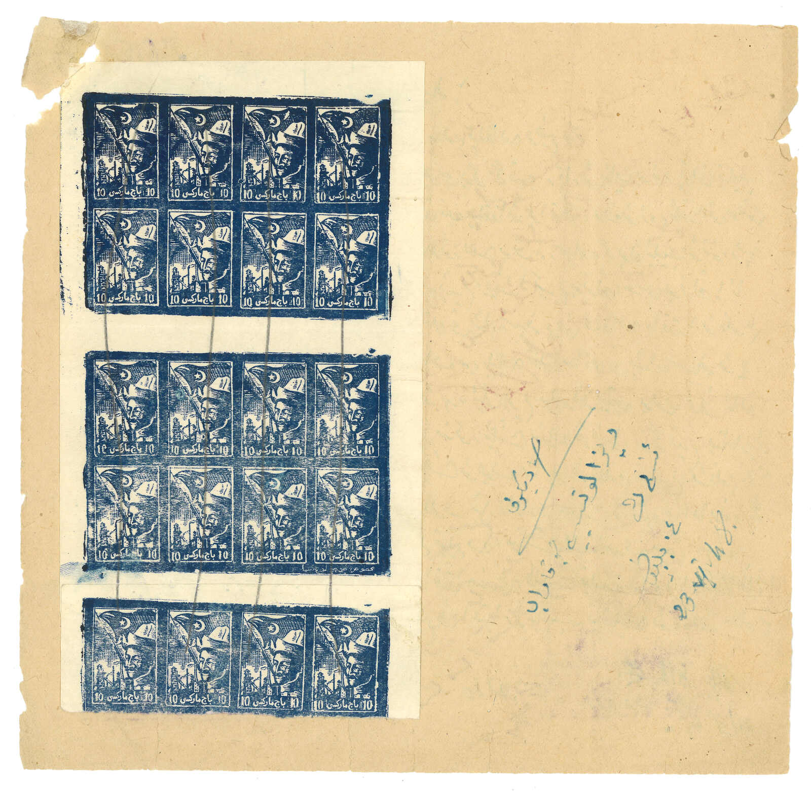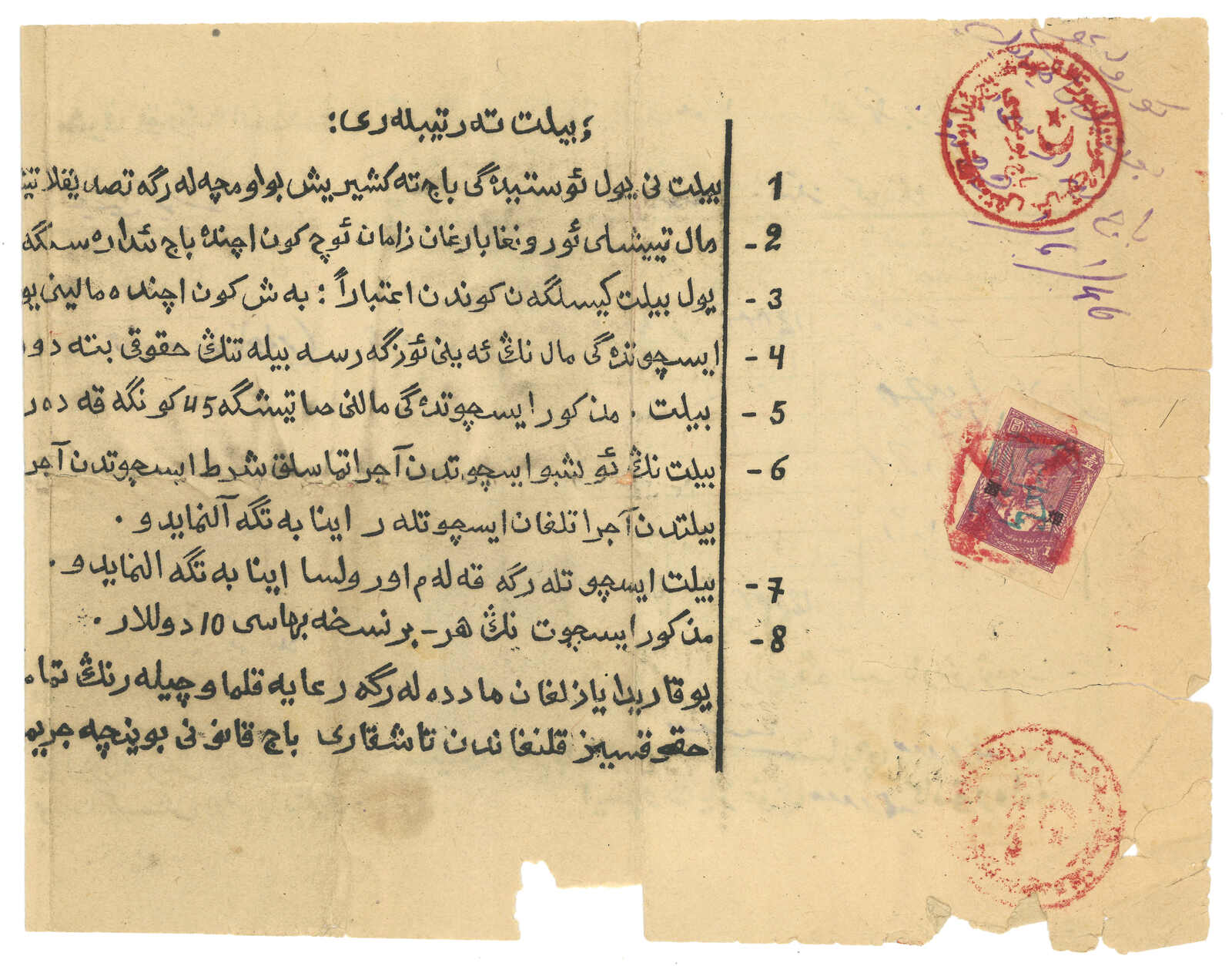 ca 1945 a receipt f.w. Kuldja ovpt. on Sinkiang revenue stamp 10c in block of 15, tied by pen stroke. In 1945, East Turkestan Republic overprinted on ROC postage and revenue stamps with character “National Bank” in Uygur. These