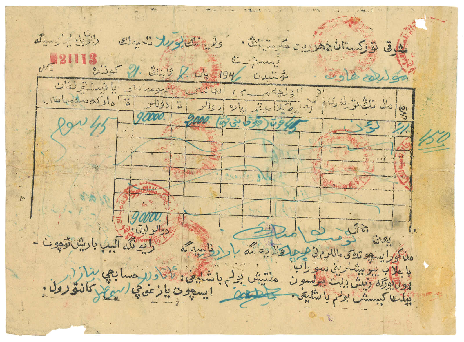 1948 (29 Sep) ROC Sinkiang provincial government tax receipt surch for use in Eastern Turkestan Republic, with Financial Bureau seal. Unique example used in Altay.