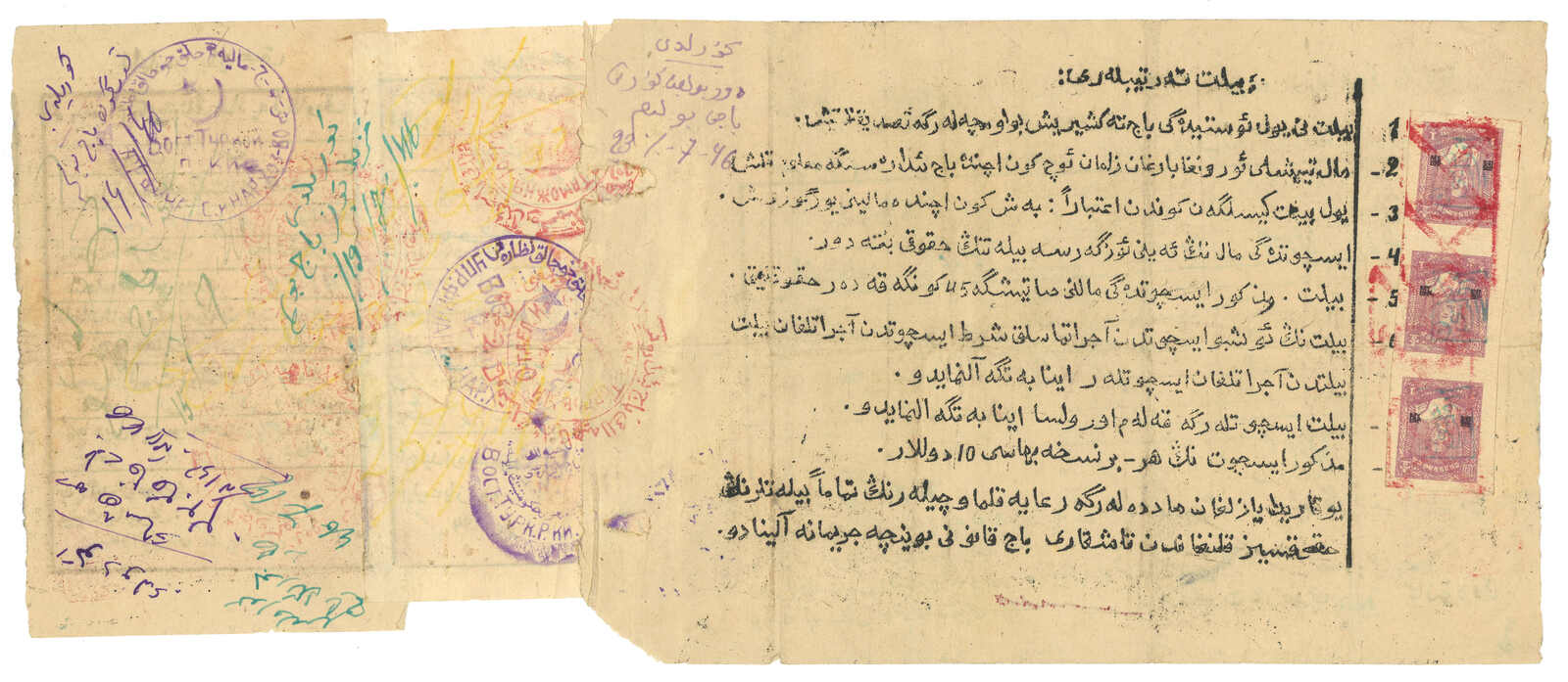 約1945年一件貼用伊犁加蓋票之單據,原票為新疆省盛世才加 蓋“煙酒”1元直三連,以交叉蓋銷,旁鈐紅色公章。三區臨時 政府在民國郵票及印花稅票上加蓋改作郵、稅兩用票。此票一直