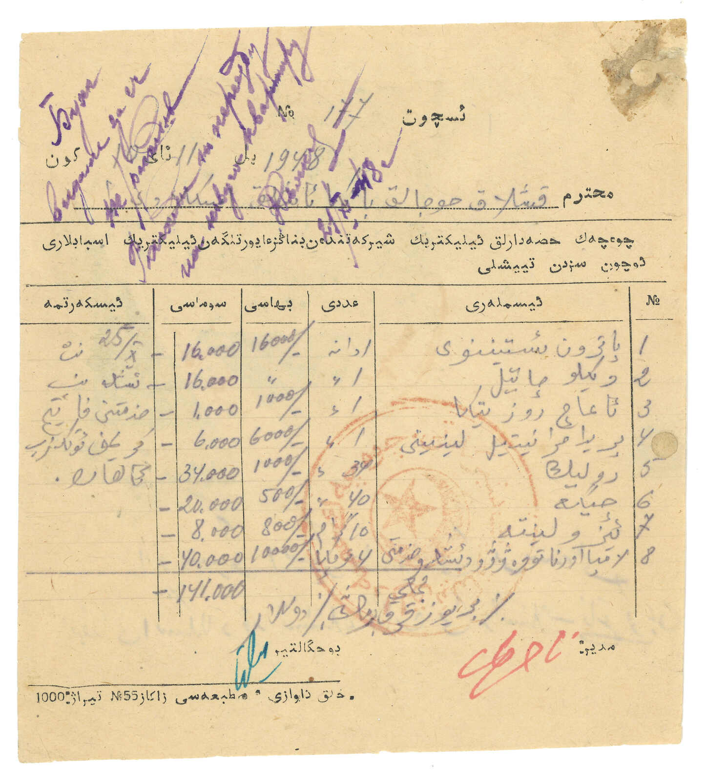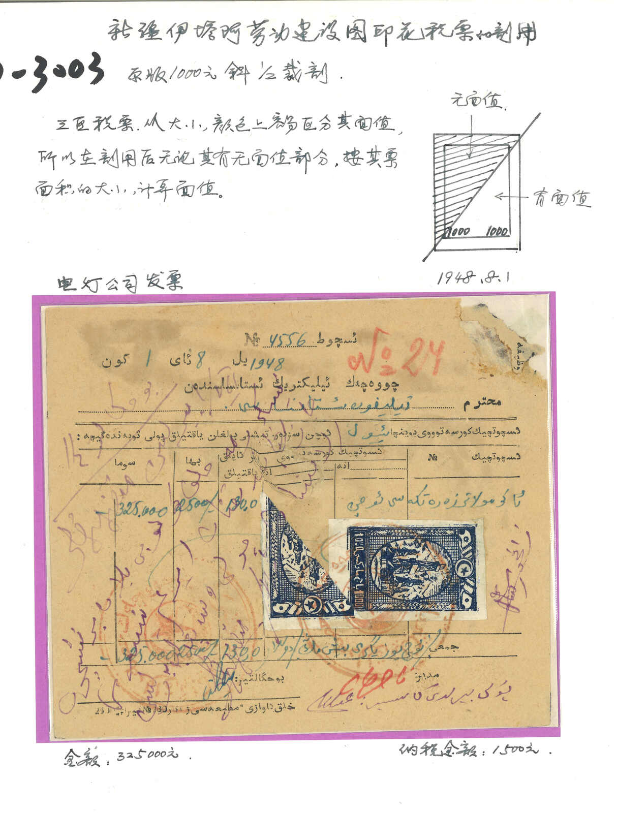1948 a receipt of elEast Turkestan Republicic company, f.w. East Turkestan Republic construction issue $1000 + bisected $1000, tied by circular red seal. Top right corner damaged. As the cut stamp may be without denomination,