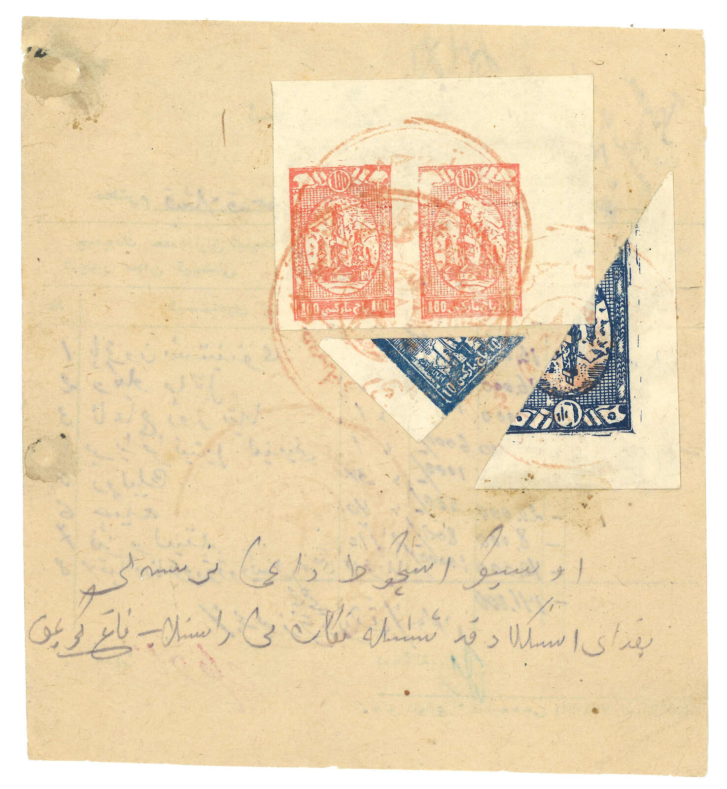 1940 a receipt f.w. East Turkestan Republic construction issue, tied by red seal. Total amount $141000 and 5% of tax, $705, was charged by franking of $100 in horizontal pair + bisected $1000 + bisected $10. Scarce combination