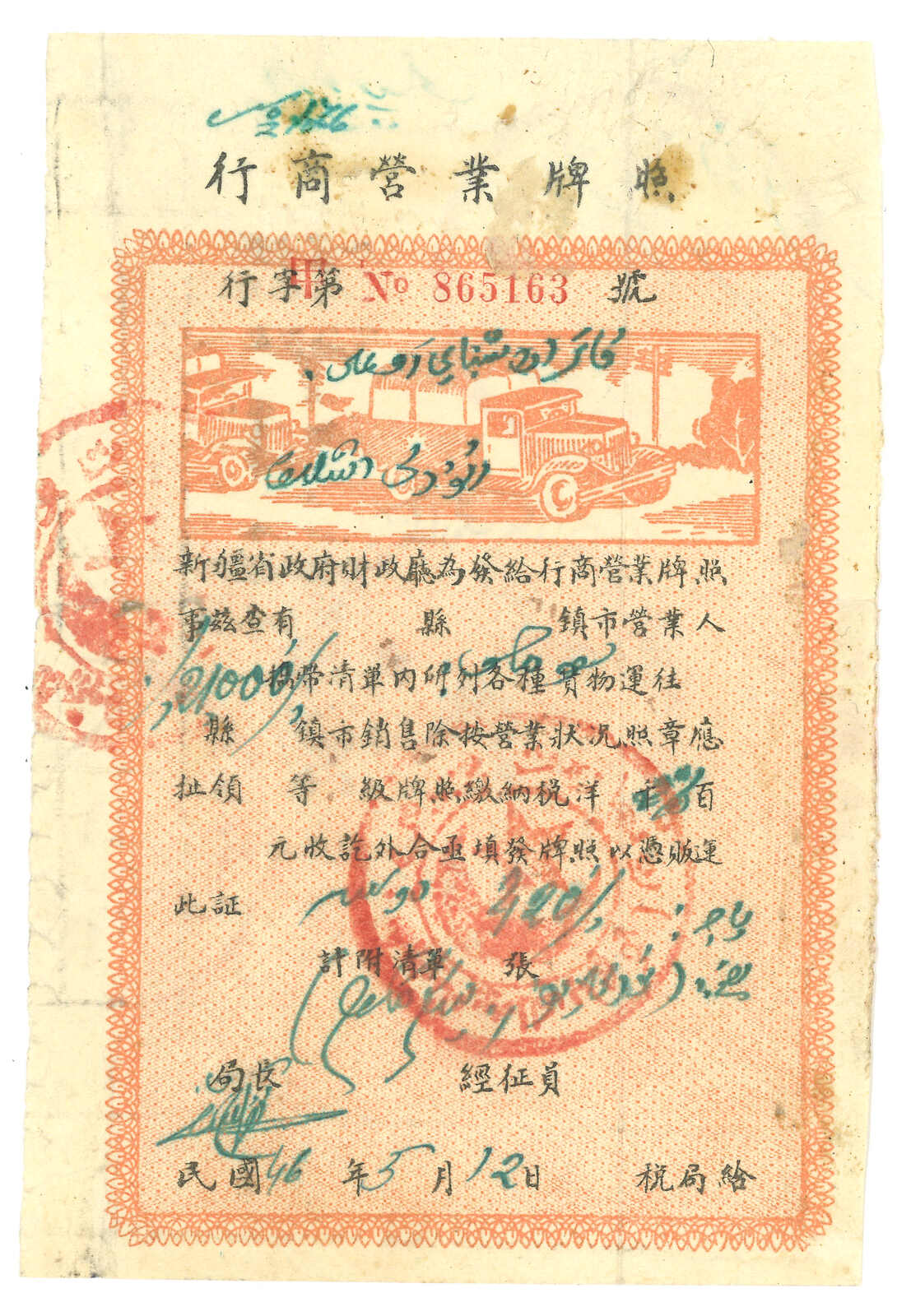 1946 (12 May) ROC Sinkiang provincial government commerical license surch for use in Eastern Turkestan Republic, with Financial Bureau seal.
