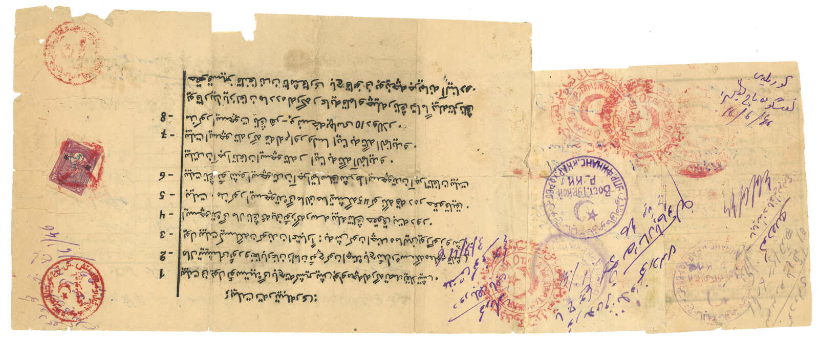 約1945年一件貼用伊犁加蓋票之單據,原票為新疆省盛世才加蓋“煙酒”1元,銷黑色交叉,旁鈐多處檢查點查驗戳記及簽