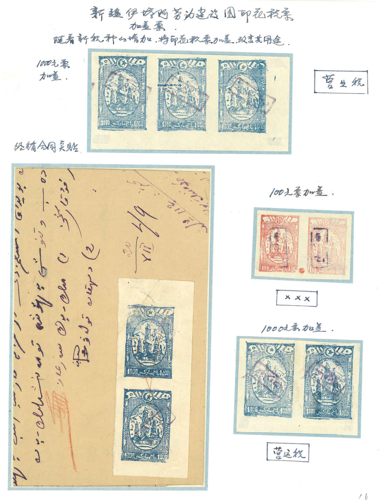 An exhibit page of East Turkestan Republic Construction issues, mounted with $100, $1000 stamp singles, multiples and piece. Rare.