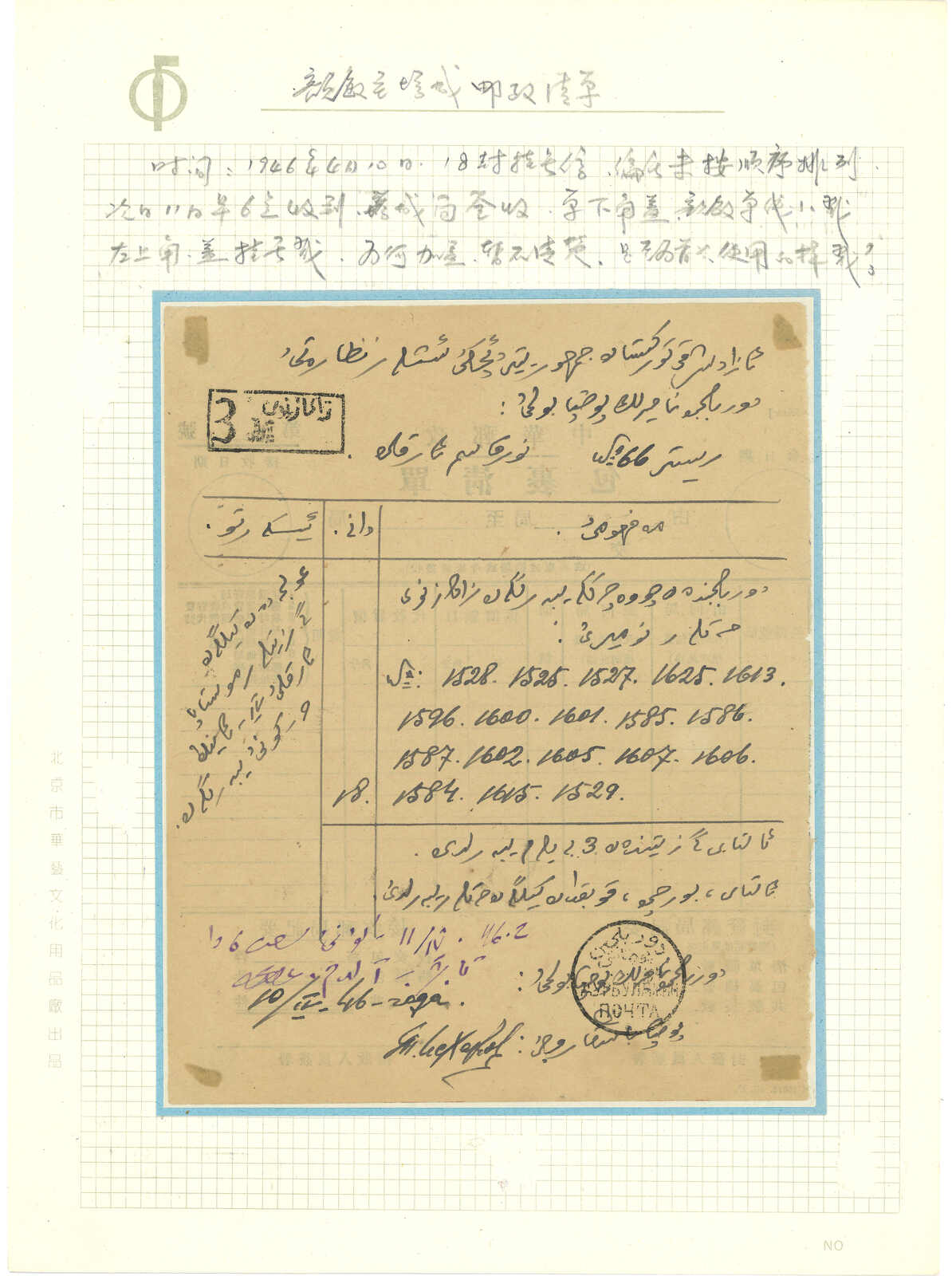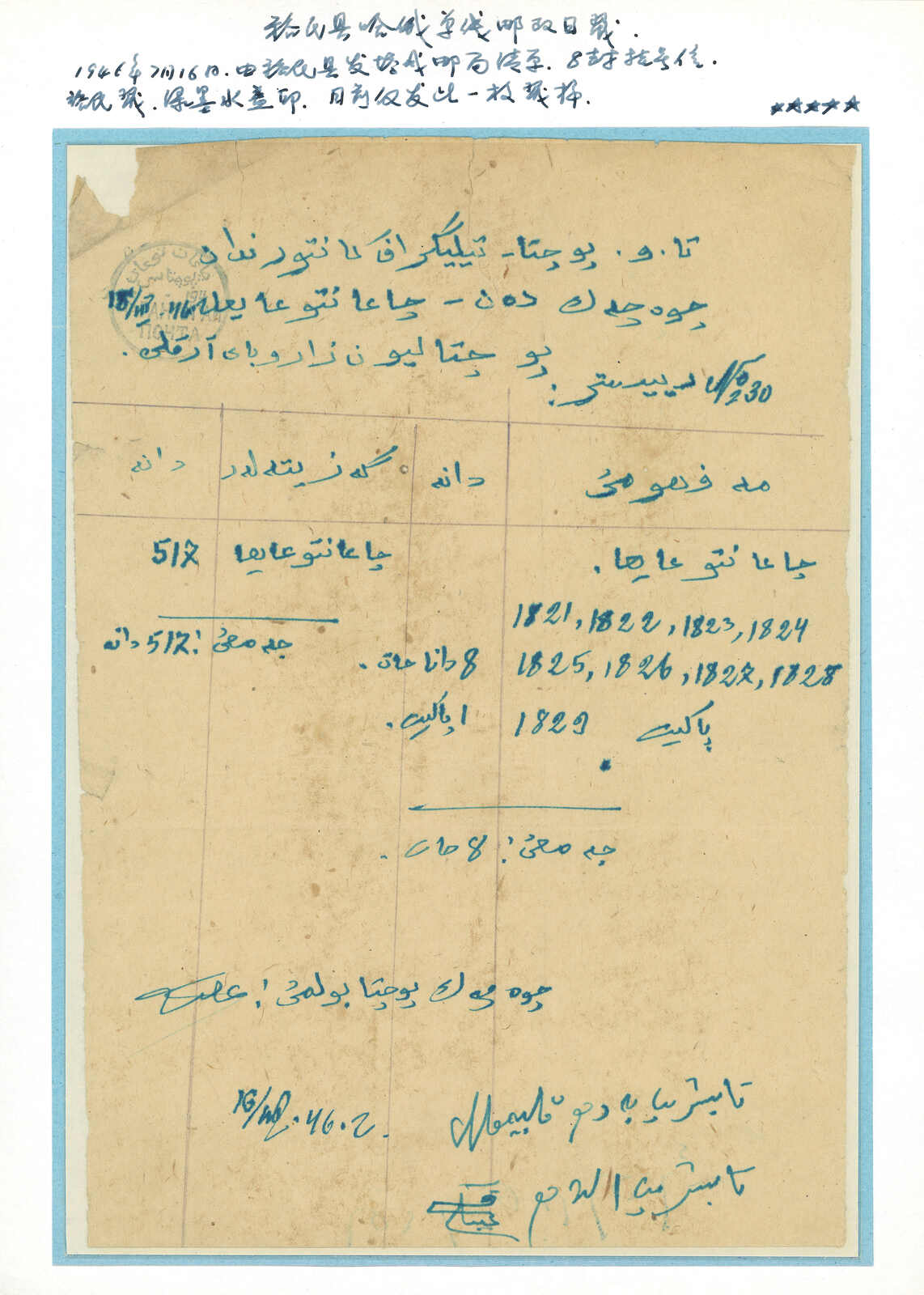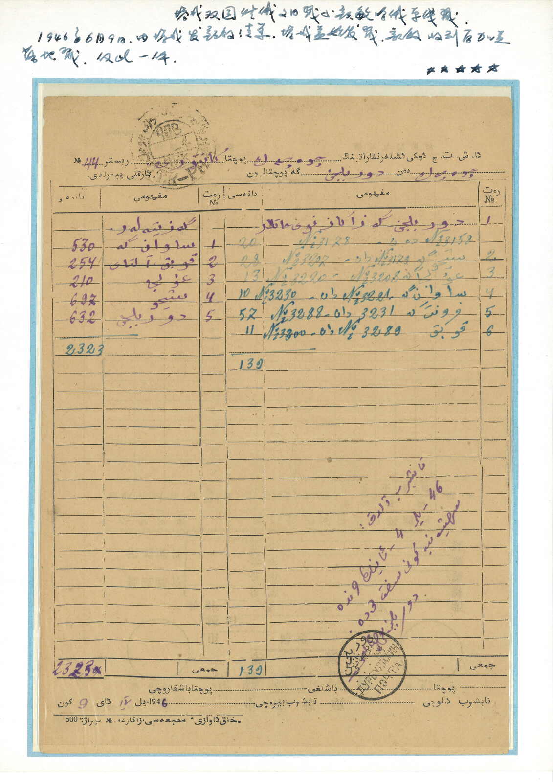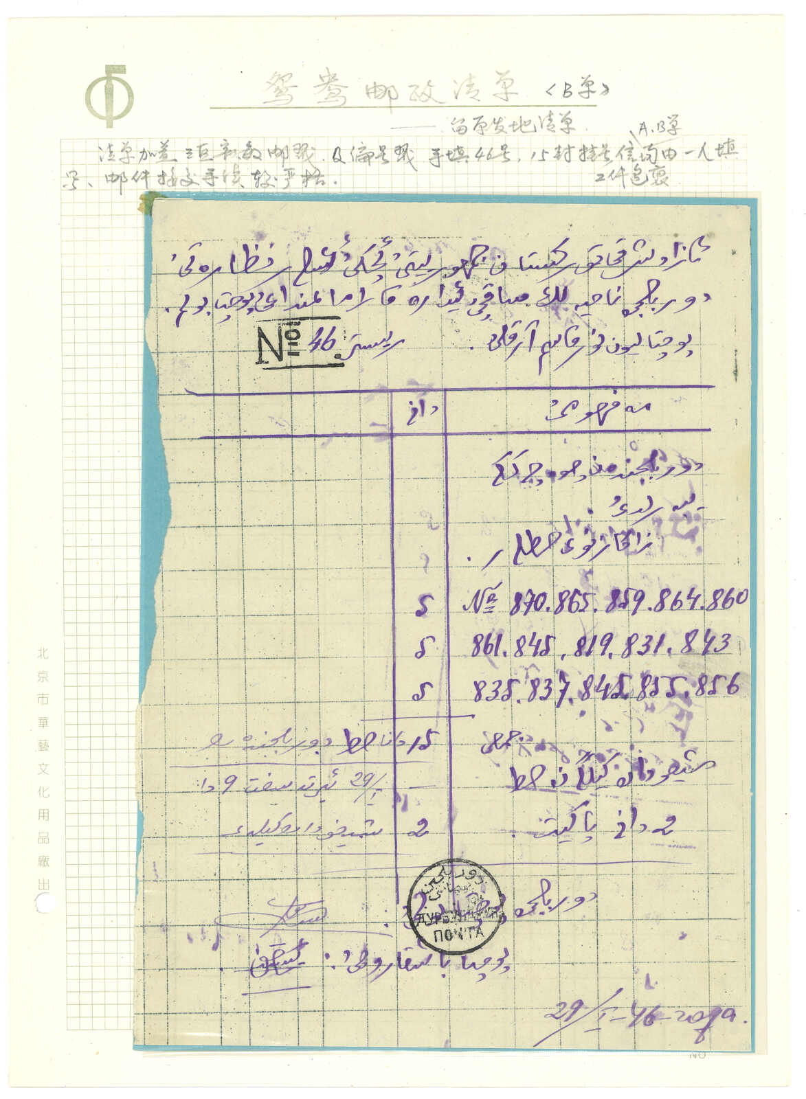 1940年代三區革命時期郵件清單一份, 鈐額敏維文俄文單圈始發日戳。(Image 1)