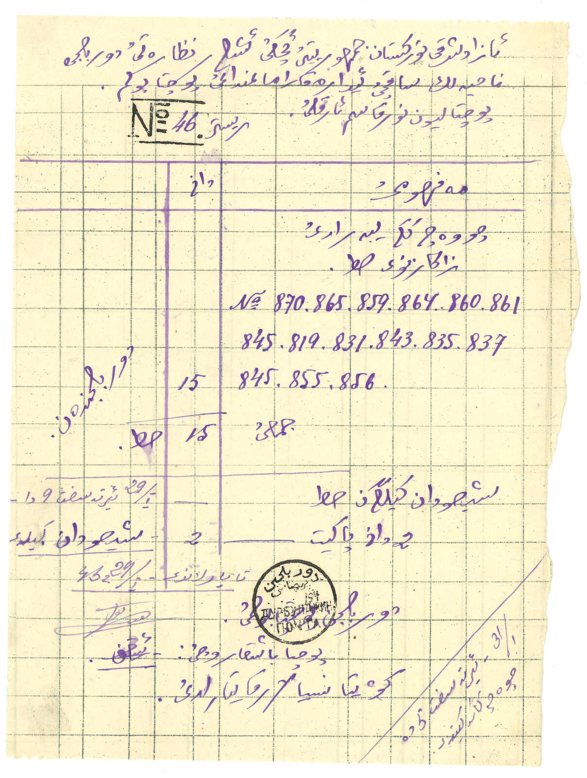 1946 (10 Apr) a mail list from Emin to Tahcheng, applied with Emin bilingual (Ugygr Russian) cds and registered mark.
