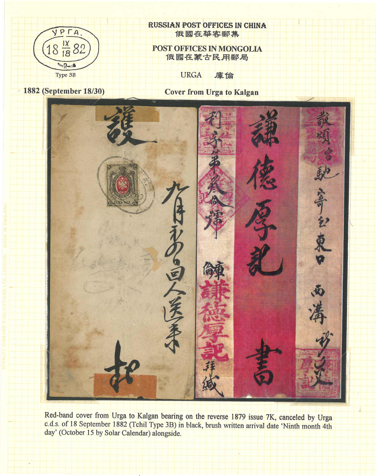 1882 Urga (18 Sep) to Kalgan. Red band cover, f.w. Coat of Arms 7k on reverse, tied by Urga Russian PO type 3b oval d.s. (month above date). Arrived Kalgan (15 Oct) according to manuscript.