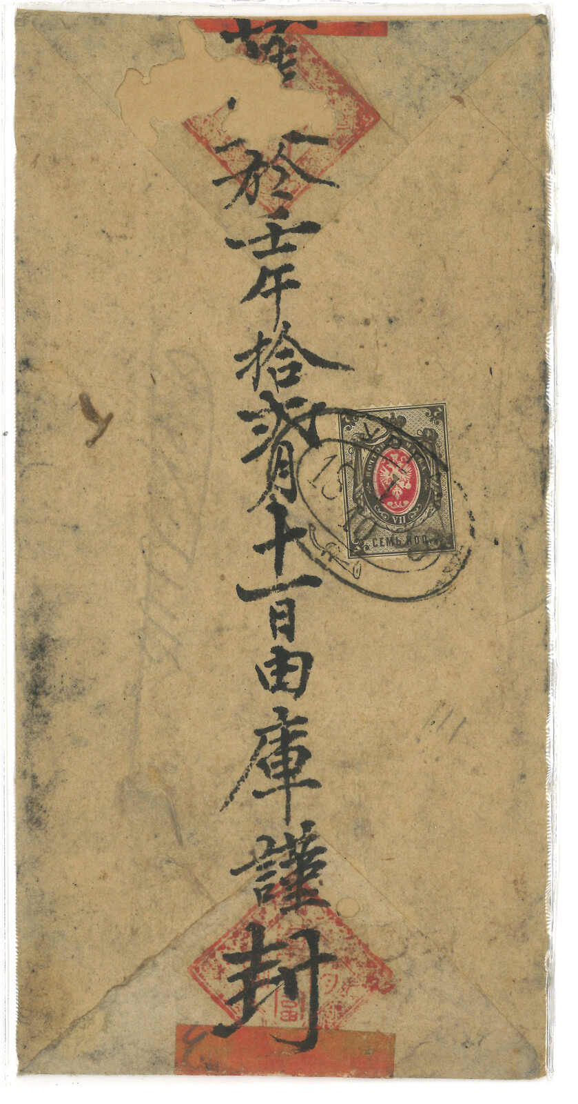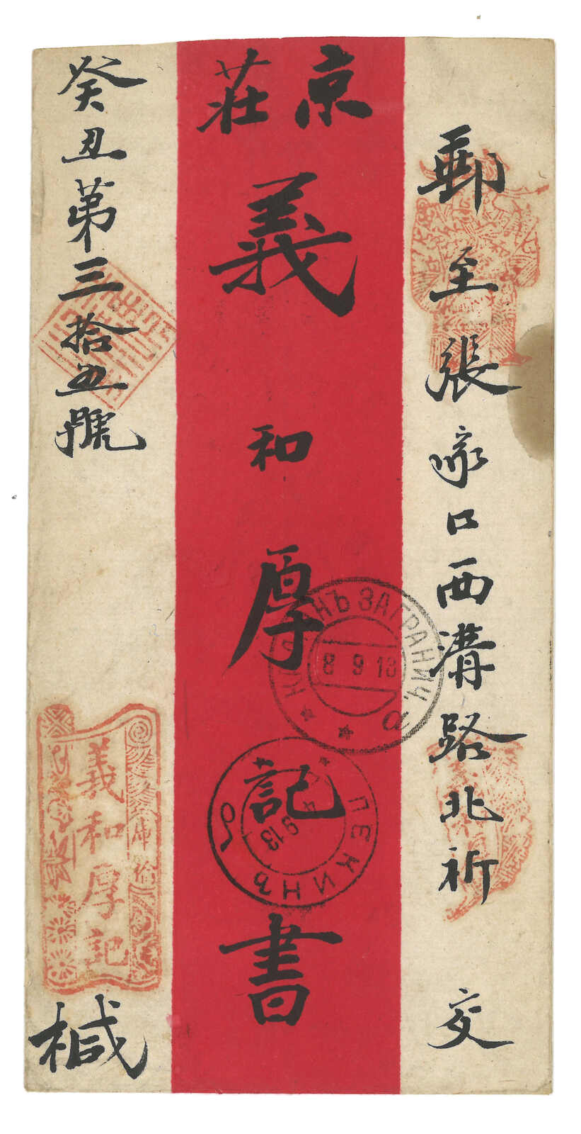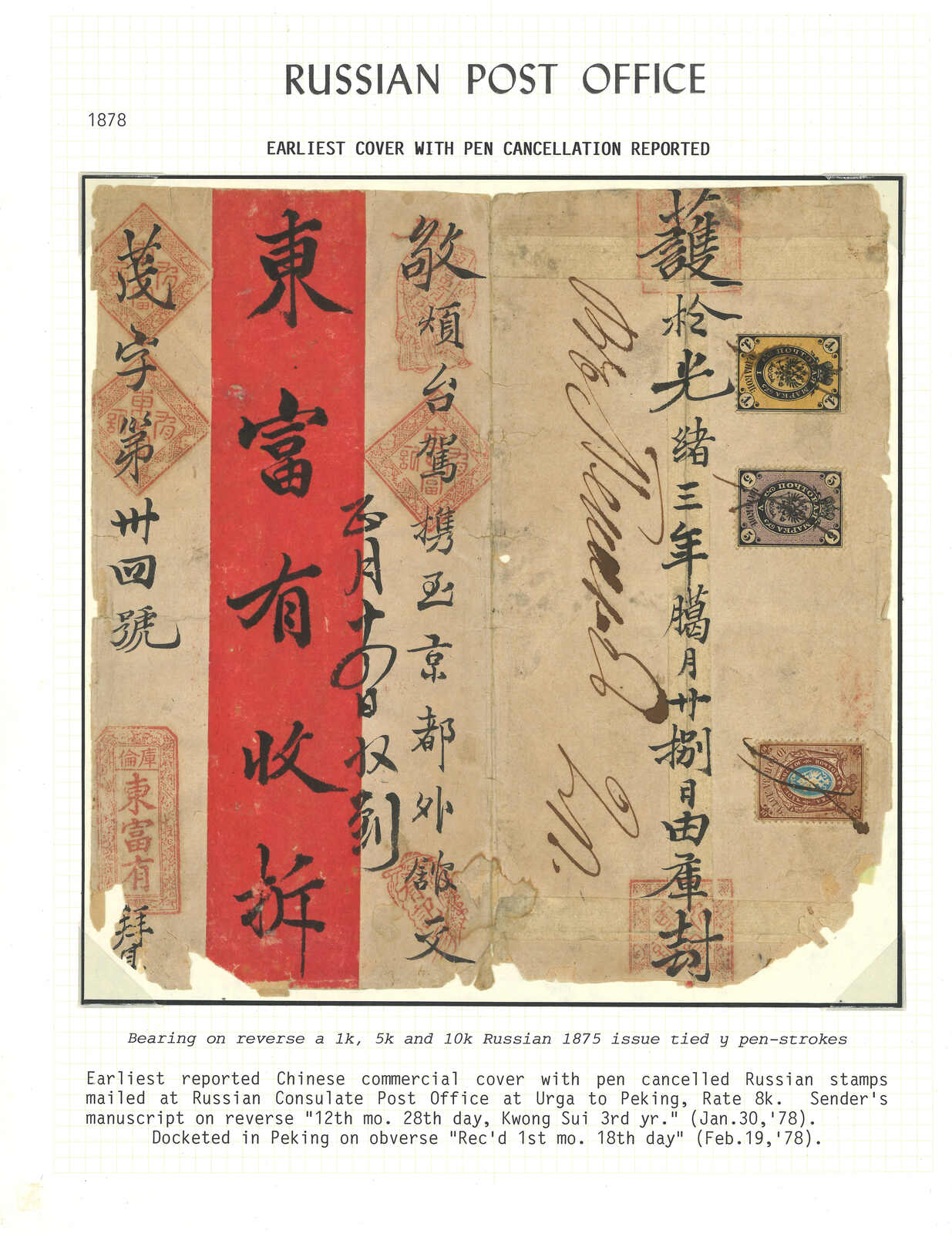 1878 Urga (30 Jan) to Peking. “Dun-Fu-Yu” red band cover, f.w. Russian Coat of Arms 1k + 5k + 10k on reverse, tied by pen stroke. Arrived Peking (19 Feb) according to manuscript. Pen cancellation is the first type of