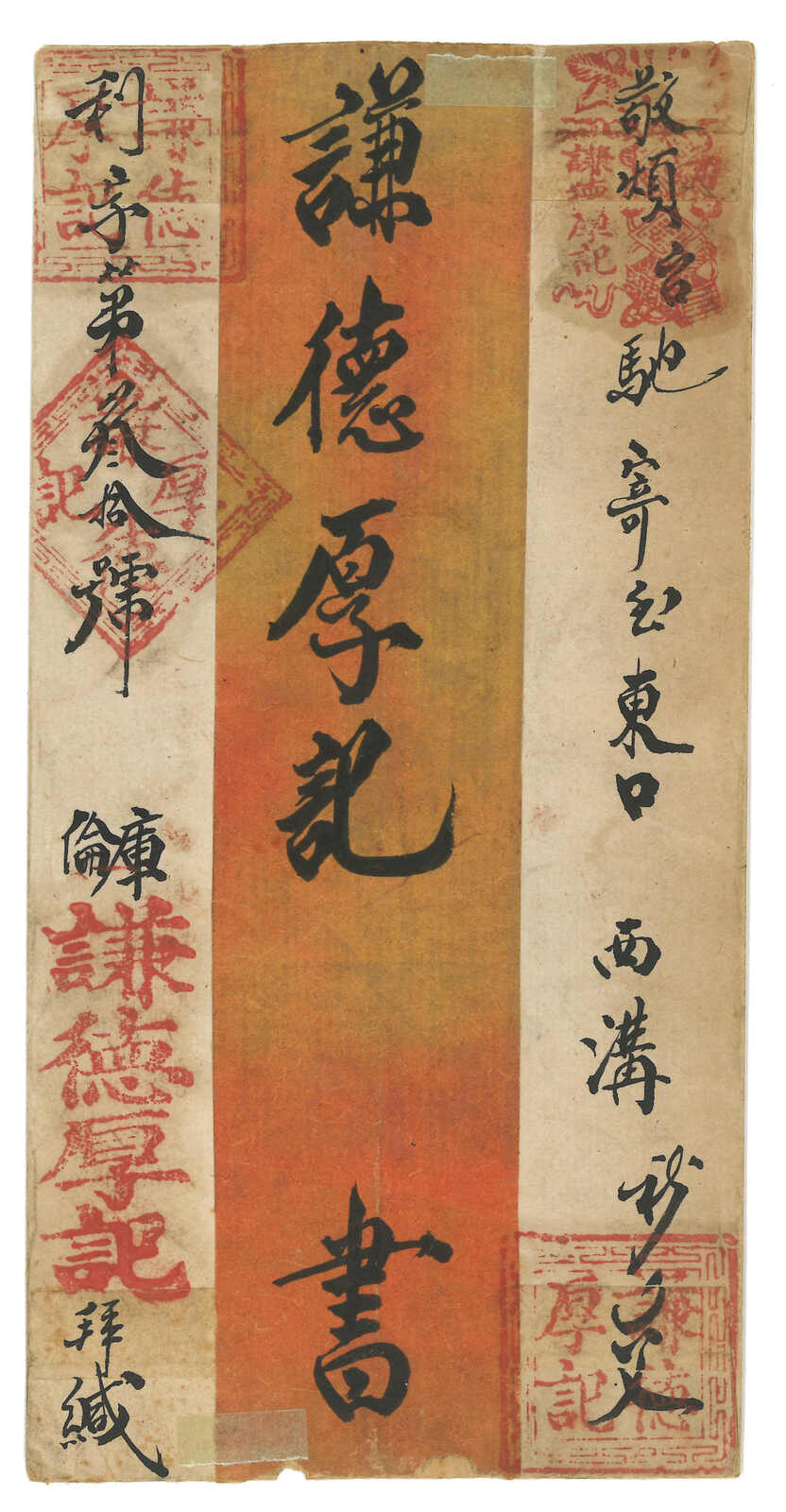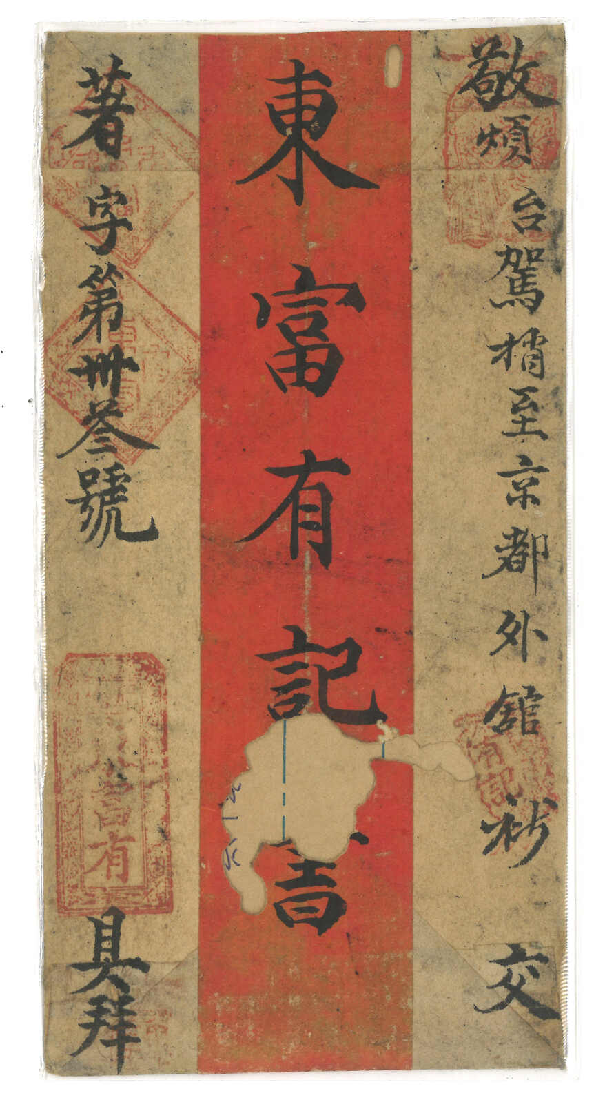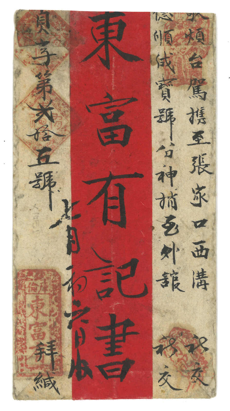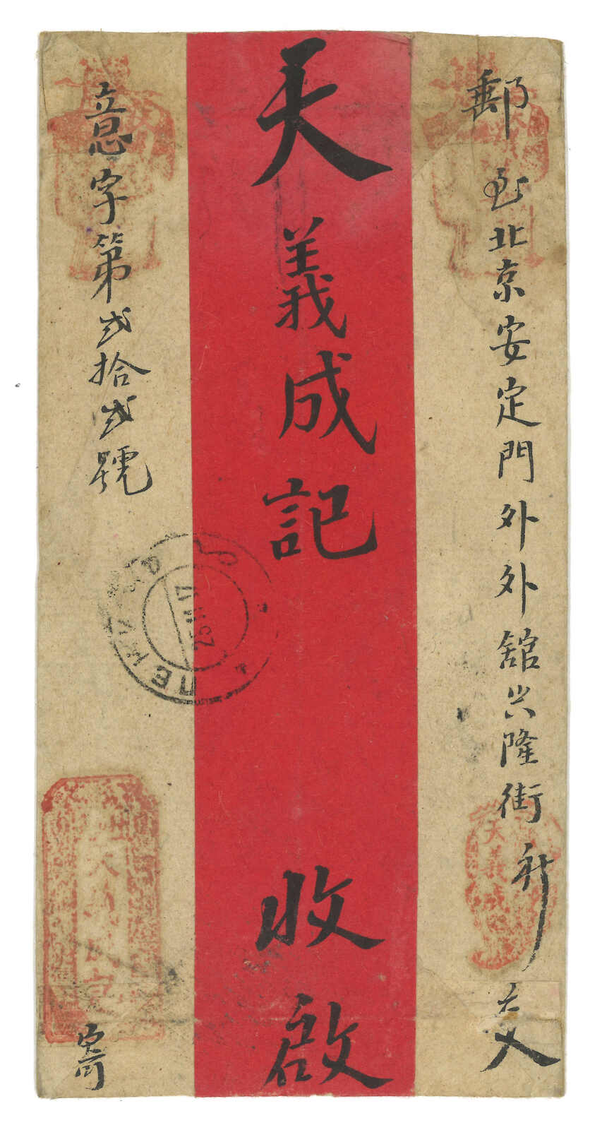 1878 Urga (30 Jan) to Peking. “Dun-Fu-Yu” red band cover, f.w. Russian Coat of Arms 1k + 5k + 10k on reverse, tied by pen stroke. Arrived Peking (19 Feb) according to manuscript. Pen cancellation is the first type of