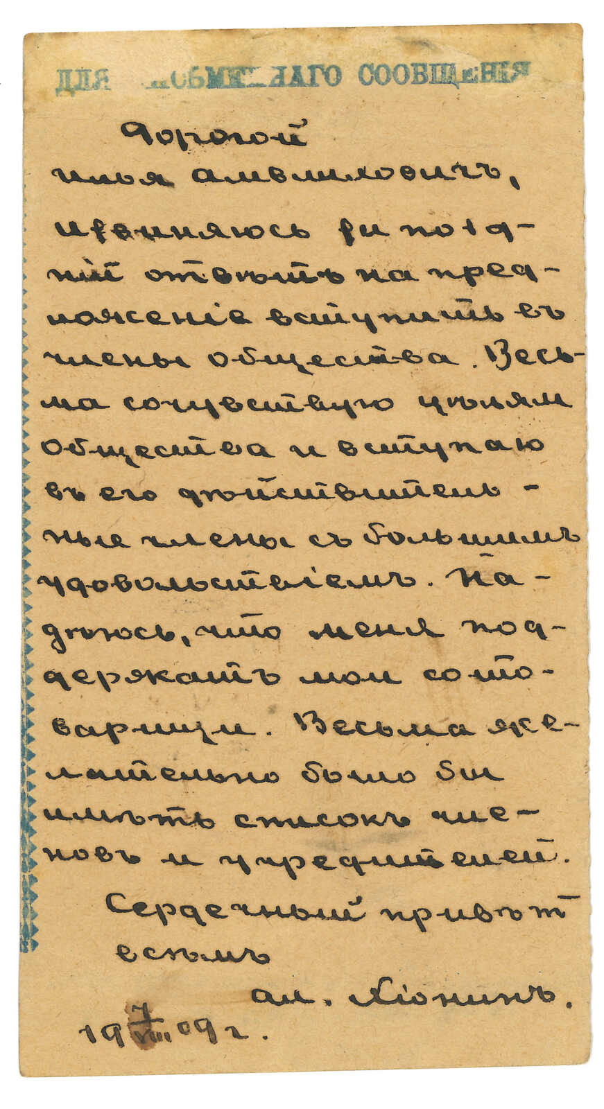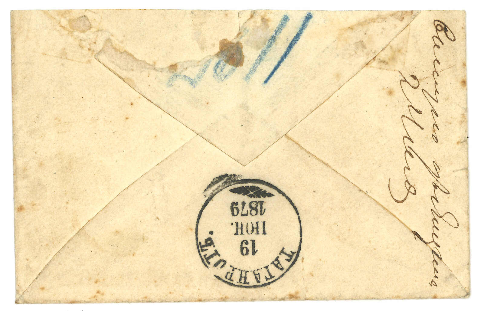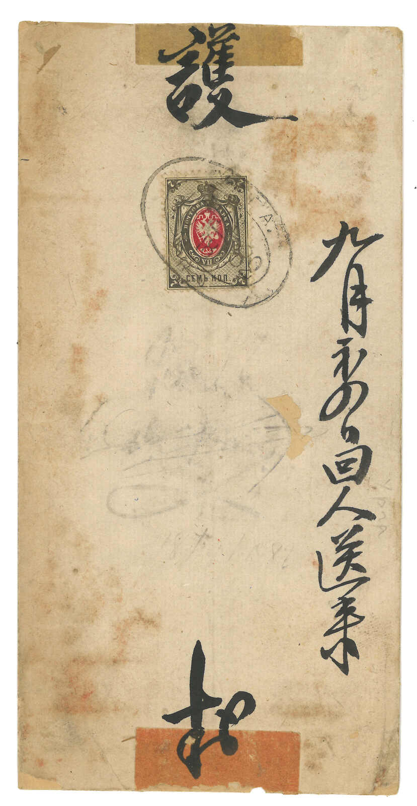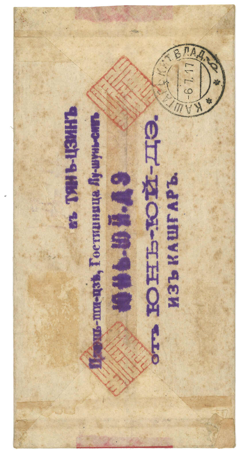 manuscript annotation in Russian “Taken out of a (mail) box 24 May”, slightly reduced at top and some light soiling. The only known example from the period of Russian occupation of Kuldja. The earliest item of mail from the Russian post in Sinkiang,
