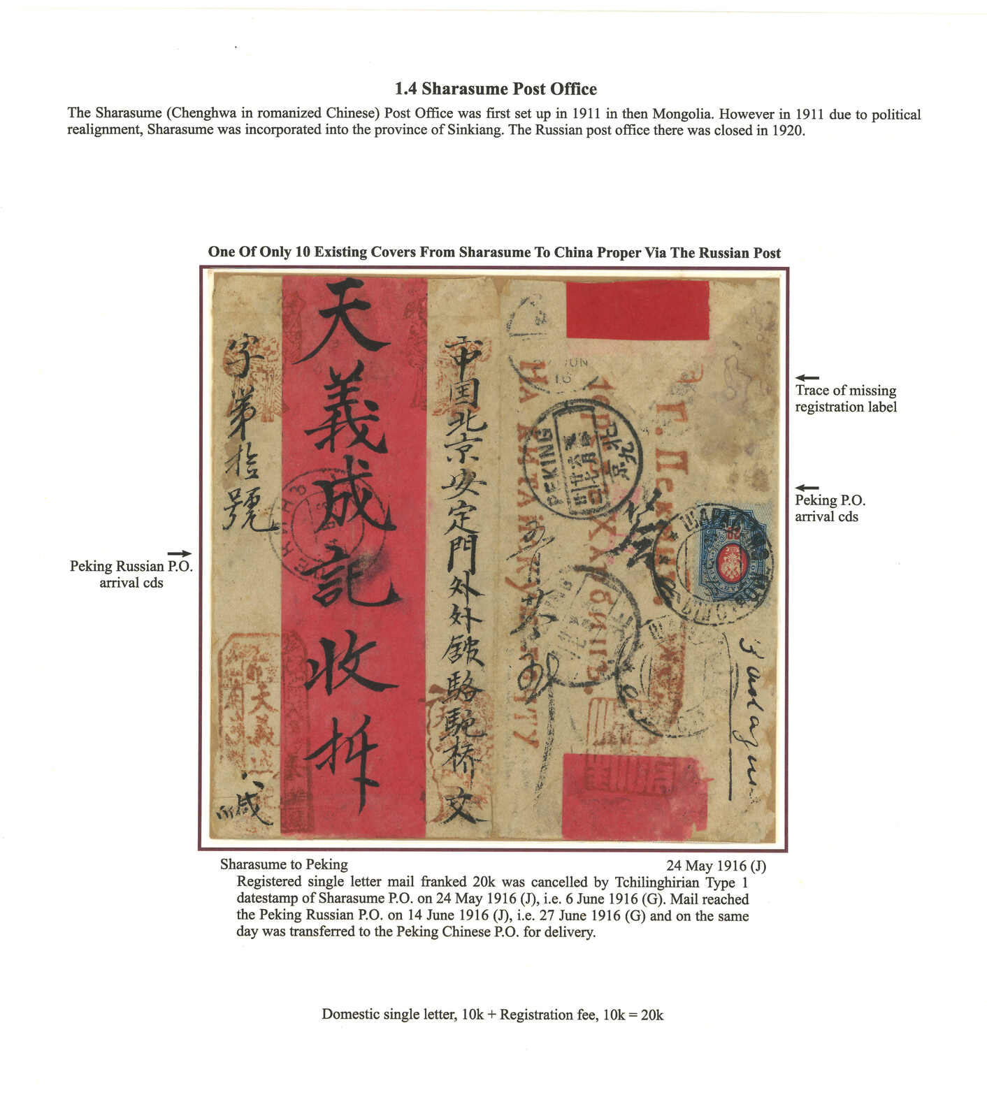 1916 Sharasume (24 May) to Peking. Red band cover, f.w. Coat of Arms 20k on reverse, tied by scarce Sharasume Russian PO cds. Transit Peking Russian PO (14 Jun). Arrived Peking Chinese PO (27 Jun). Cover opened out for display.